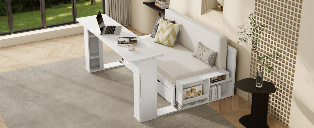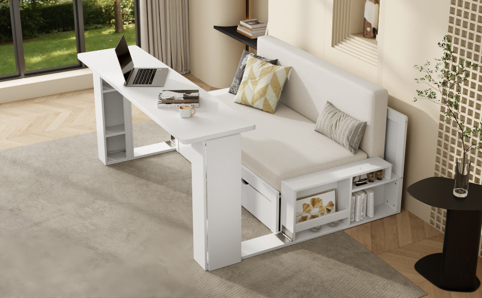 - 4-in-1 Multifunctional Design: Sofa, full-size bed, desk, and storage for versatile use.