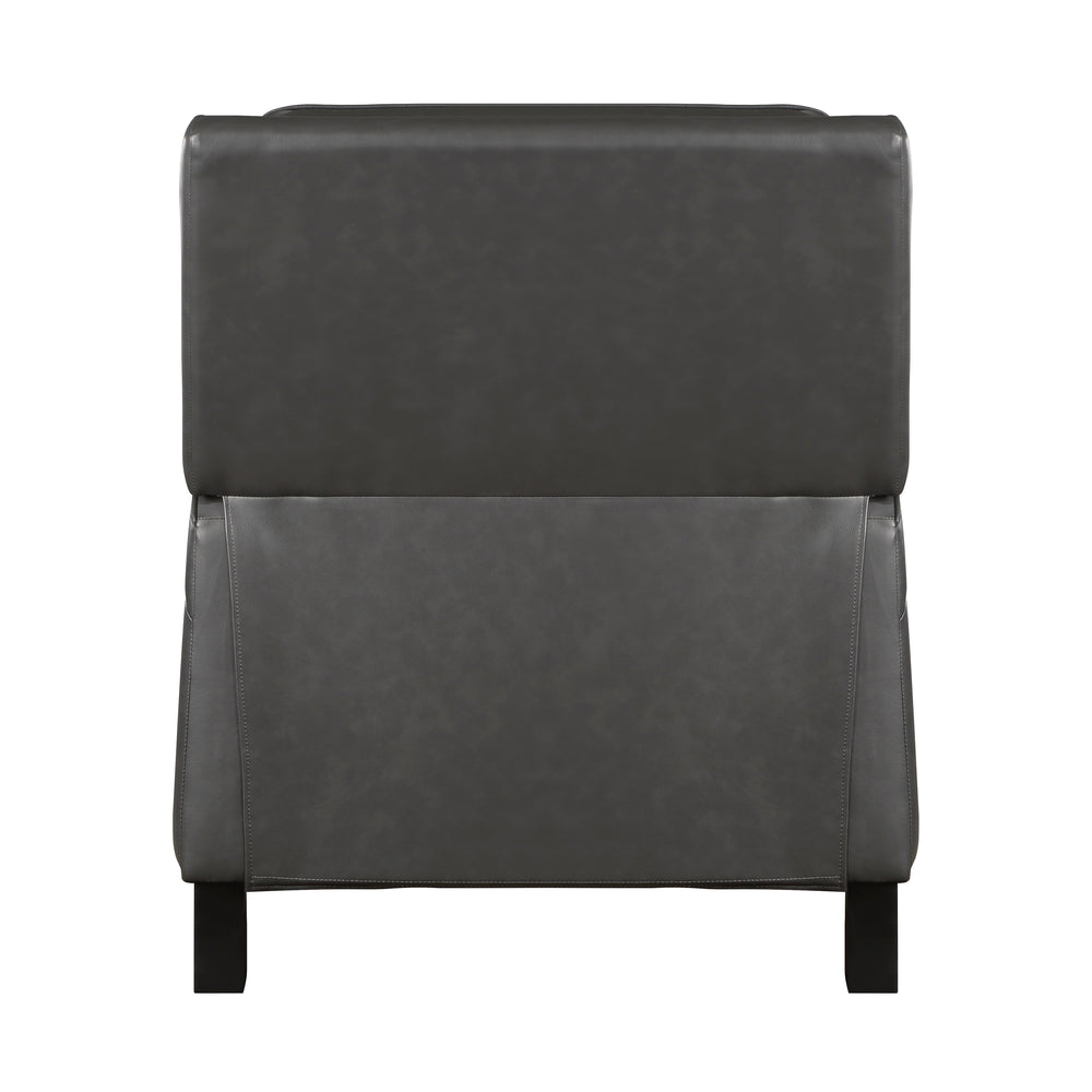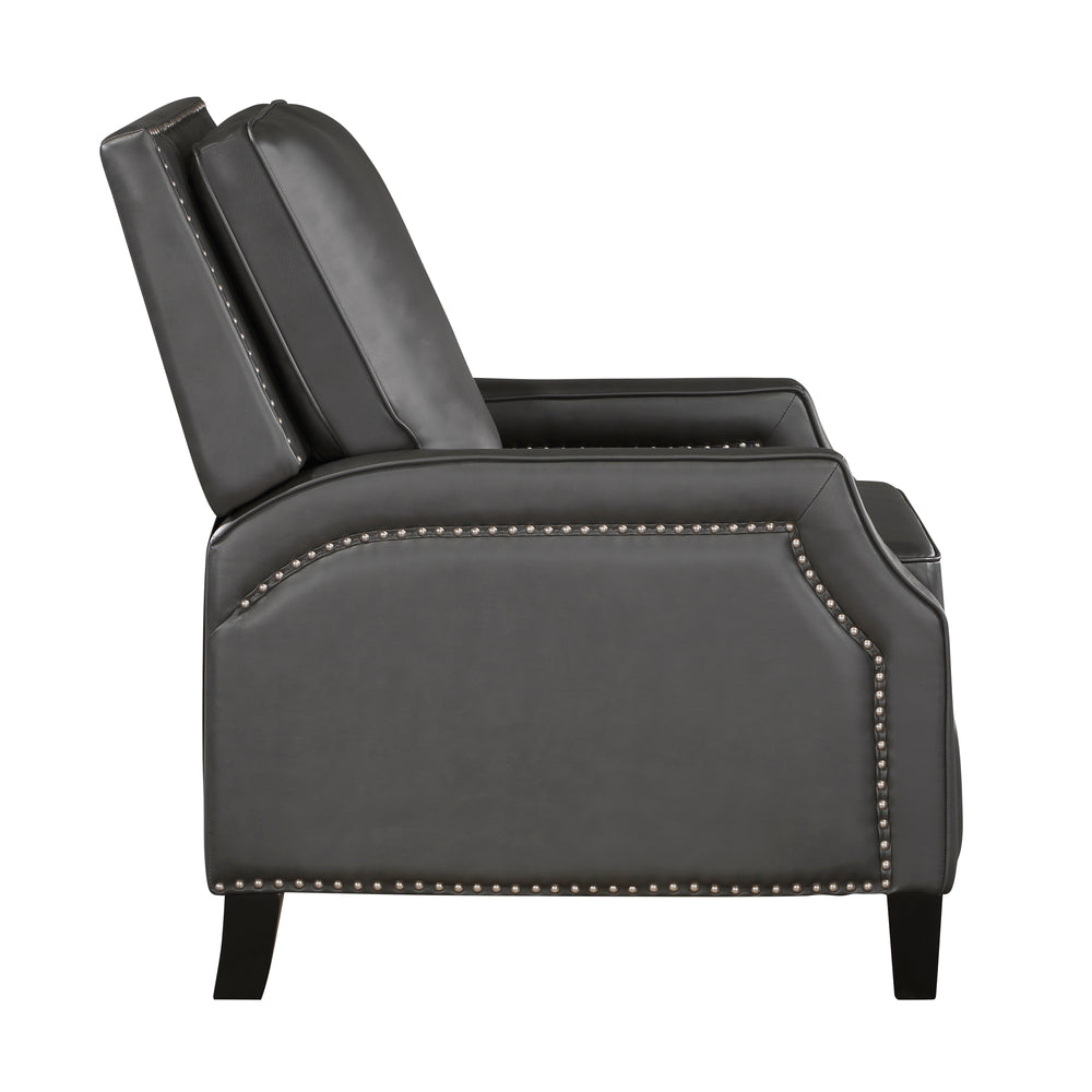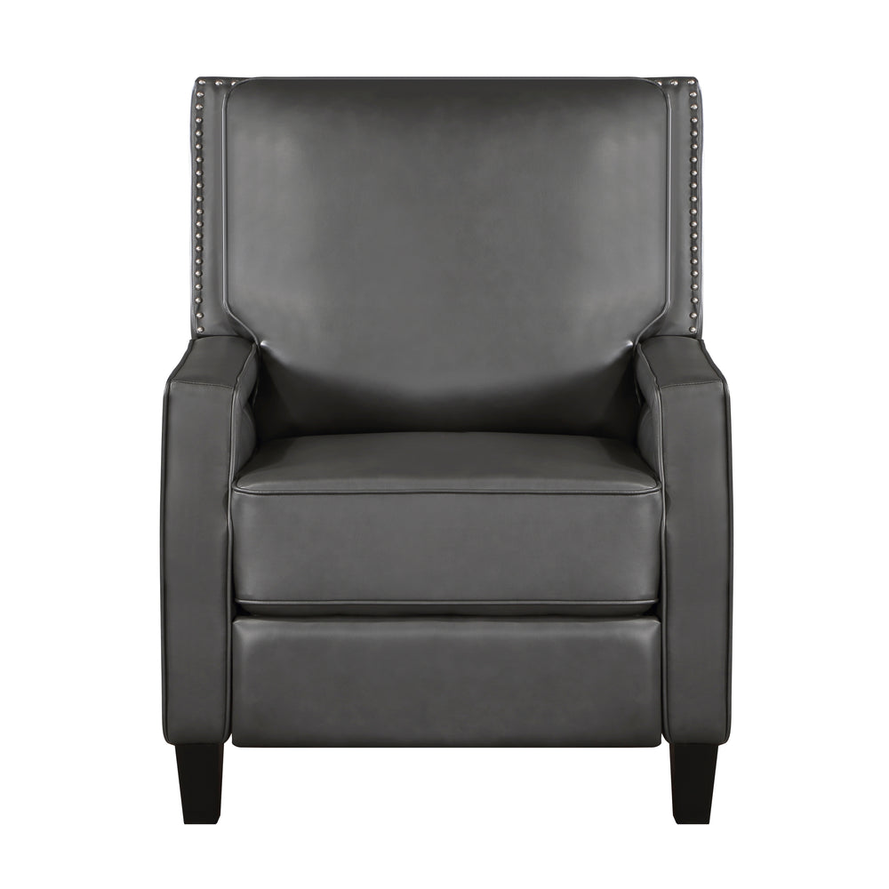 Sink into comfort with this stylish gray push back reclining chair, designed to transform your living space. Featuring a solid wood and plywood frame with a metal-reinforced seat, it offers exceptional durability and stability. The chair’s transitional style, enhanced by gray faux leather upholstery and elegant nailhead trim, complements modern and classic décor alike. Plush foam padding over pocket coils cushions each seating moment, while the attached back and seat cushions provide long-lasting support. With a simple push-back reclining motion, you can effortlessly shift into your preferred lounging position, reaching a fully reclined length of 63.5 inches. Its exposed black-finished wood feet add a refined touch to your home. Easy to assemble and built to hold up to 300 lbs, this chair is the perfect blend of comfort, style, and functionality. Elevate your relaxation today.