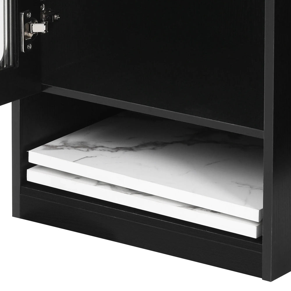 - Classic and Modern Style: Black finish with natural wood tone and glass cabinet door for a sophisticated look.