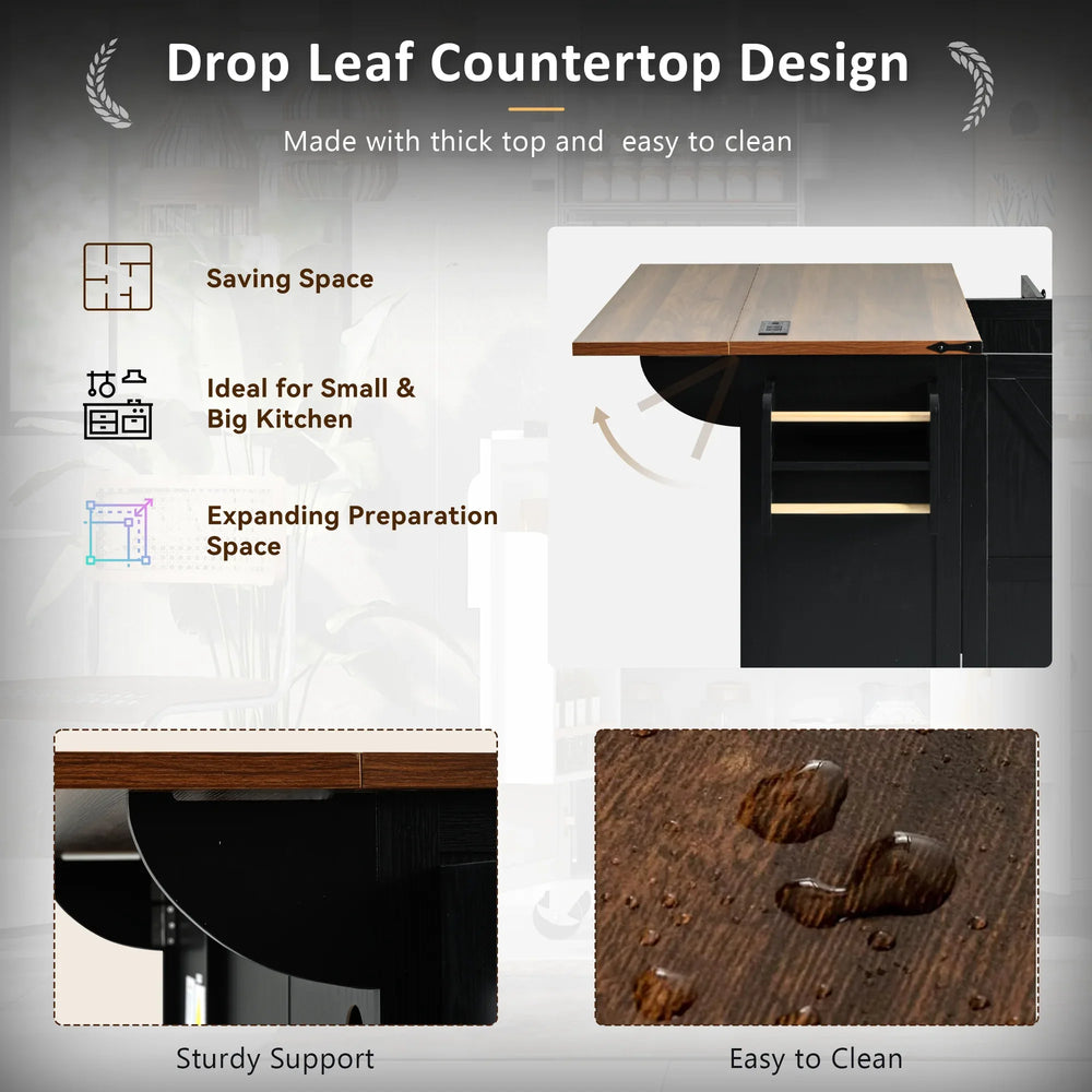 Farmhouse kitchen island with black wood grain finish features a sturdy 1” thick tabletop supporting up to 400 lbs, three smooth-glide drawers, two barn doors with 2-tier spice racks, a large drop leaf, built-in power outlets, and locking wheels for versatile kitchen storage and mobility.