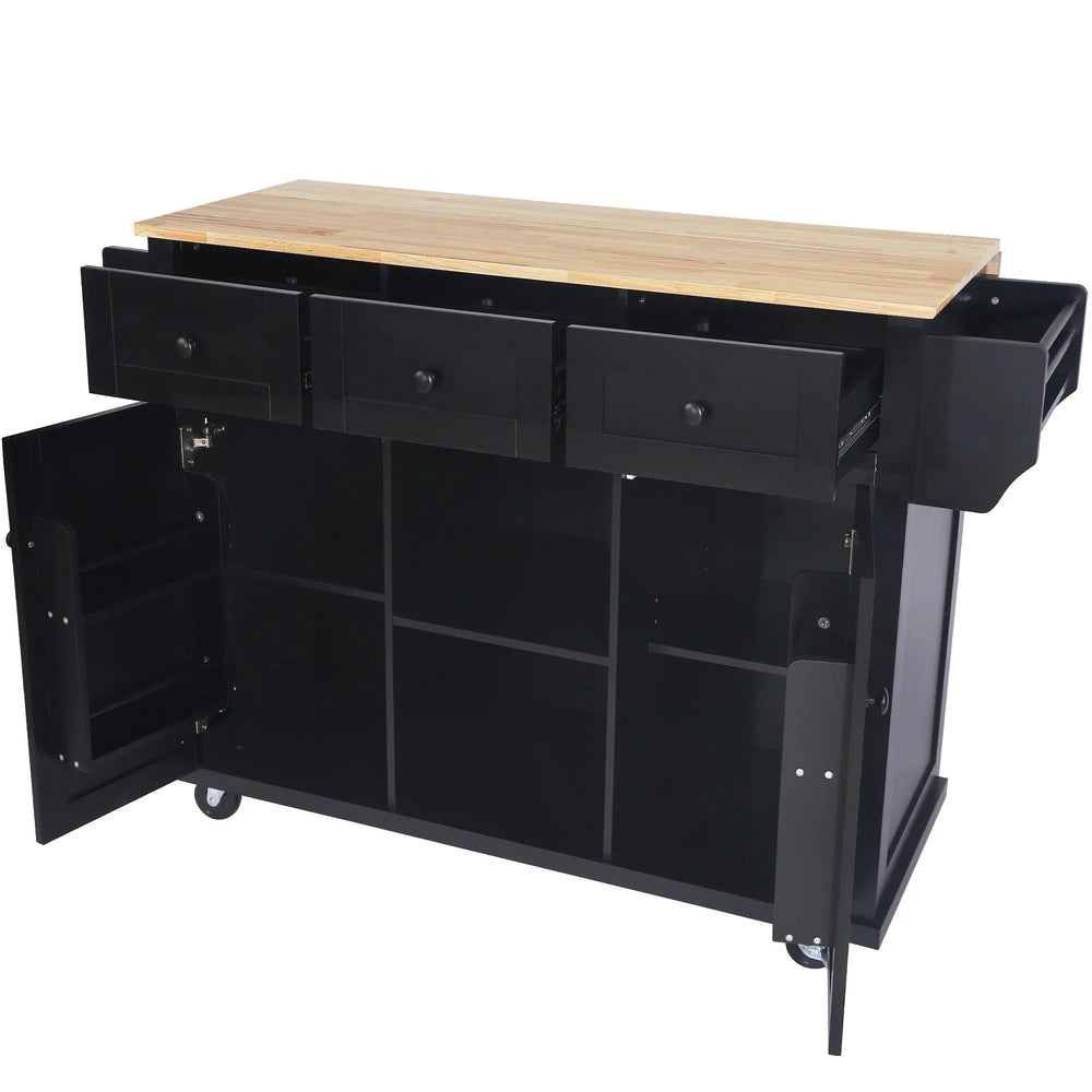 This stylish kitchen cart combines functionality and contemporary design to maximize your kitchen space. Featuring a durable rubber wood drop-leaf countertop, it provides ample room for meal prep or dining, while the sturdy metal support ensures long-lasting stability. The cabinet door’s internal storage racks, inspired by refrigerator doors, offer adjustable and removable shelves to keep your kitchen essentials organized without taking up extra space. Equipped with five smooth-rolling wheels—two with locking brakes—you can easily move the island or switch to solid wood feet for a stationary setup. With three spacious drawers, an adjustable shelf, a towel rack, and a spice rack, this kitchen island cart helps you maintain a neat and efficient cooking area. Simple to assemble and crafted from quality MDF and rubber wood, this black kitchen cart is the perfect blend of style and practicality. Elevate your kitchen organization and workflow today.