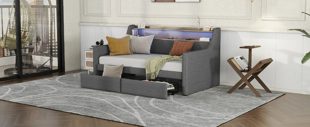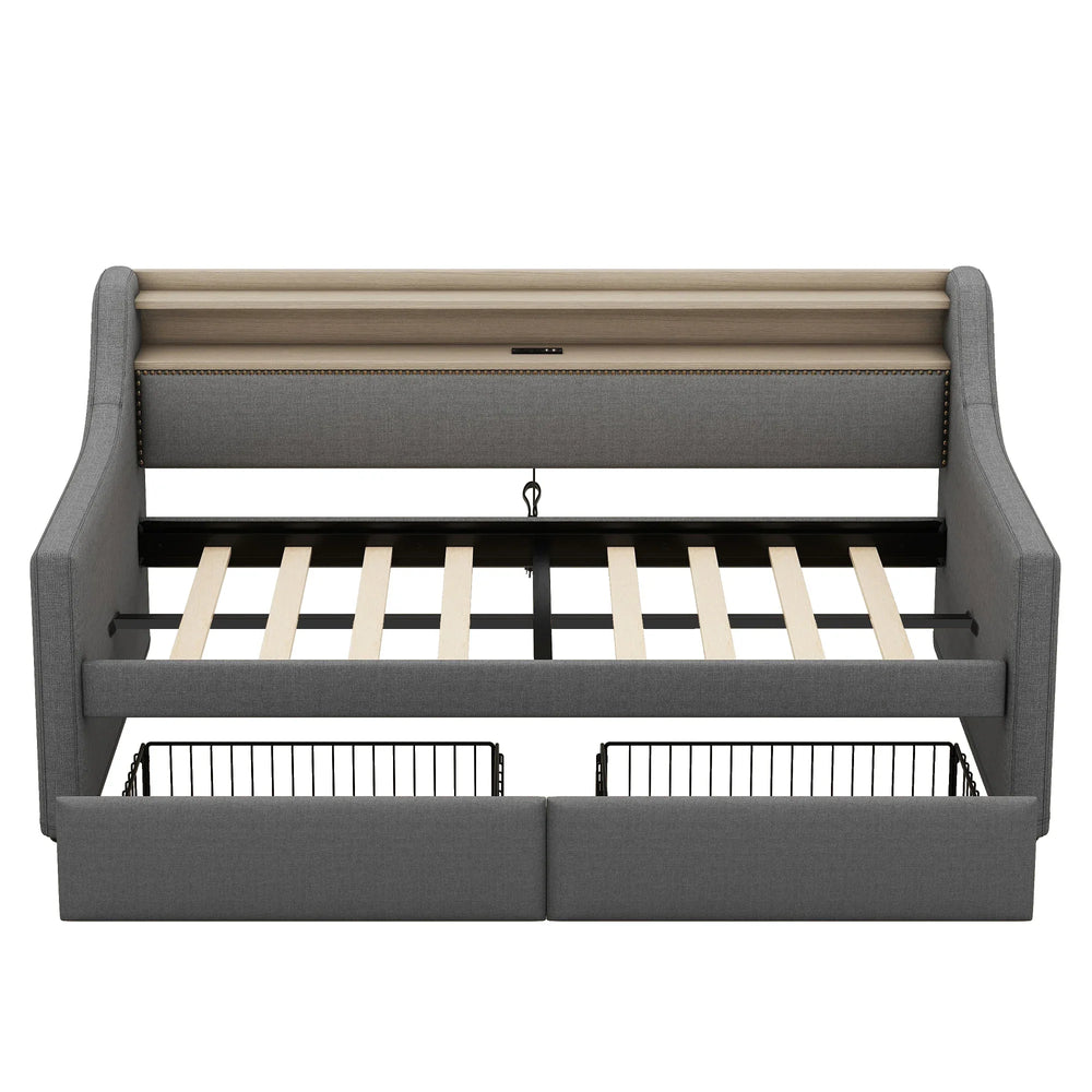 Twin Linen Upholstered Daybed With Storage Drawers Charging Station