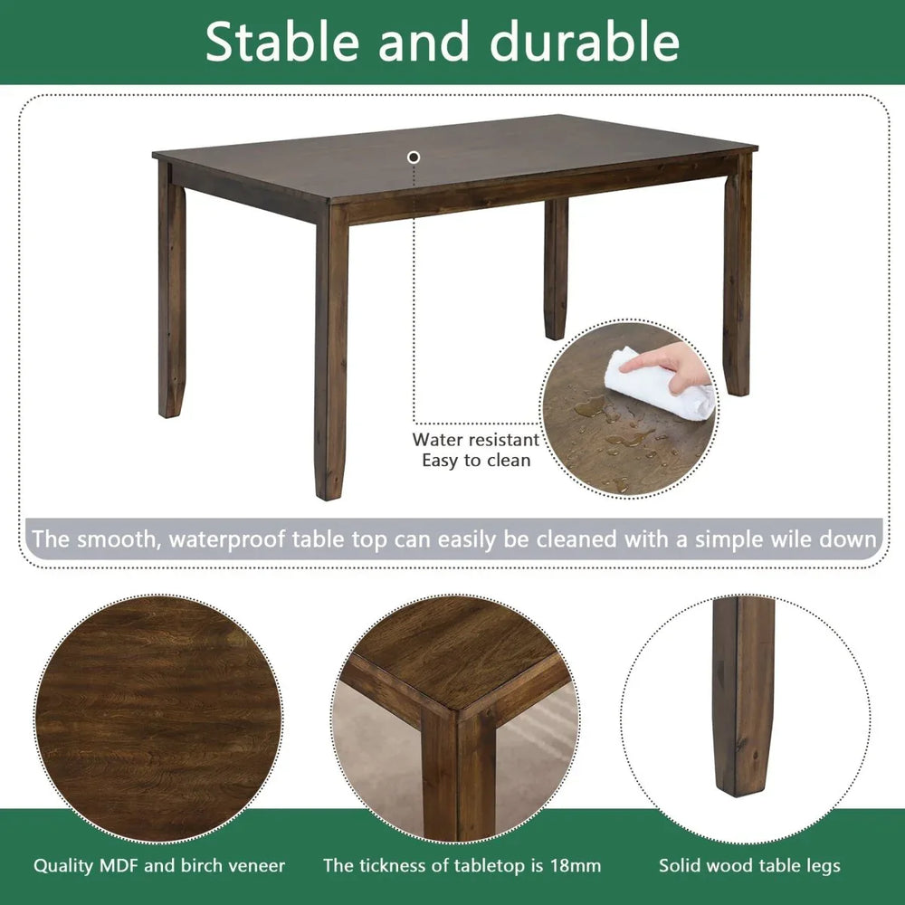 Bring modern sophistication to your dining space with this elegant 6-piece wooden dining table set. Crafted from durable Acacia wood and featuring a smooth MDF and birch veneer tabletop, it combines natural beauty with lasting strength. The rectangular table comfortably seats six with four upholstered chairs and a bench, making it perfect for family meals or entertaining guests. Plush foam cushions and linen fabric ensure comfort during long dinners. The stable wood frame and non-slip feet protect your floors while providing solid support. Easy to clean and assemble, this walnut dining set effortlessly enhances any kitchen, dining room, or living area with its sleek and timeless design. Elevate your dining experience today.
