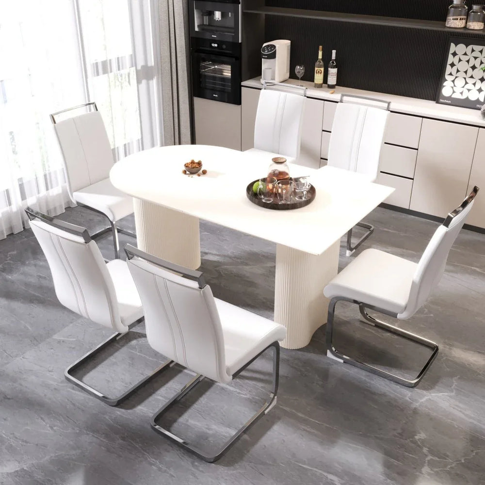 Bring timeless elegance and modern comfort to your home or kitchen with this 7-piece dining table and chair set. Crafted from sturdy MDF in a warm cream white finish, the spacious table features thick wavy legs that add a unique medieval modern touch while providing excellent stability. Six ergonomically designed PU armless chairs with silver plated metal C-shaped legs offer sleek style and comfort, perfect for family meals or entertaining guests. The stain-resistant tabletop ensures easy cleaning, making daily use effortless. Designed to blend seamlessly with various decor styles from traditional to contemporary, this set transforms your dining area into a stylish and inviting space. Assembly is quick and simple with included instructions and tools. Elevate your gatherings with this fashionable and durable dining set today.