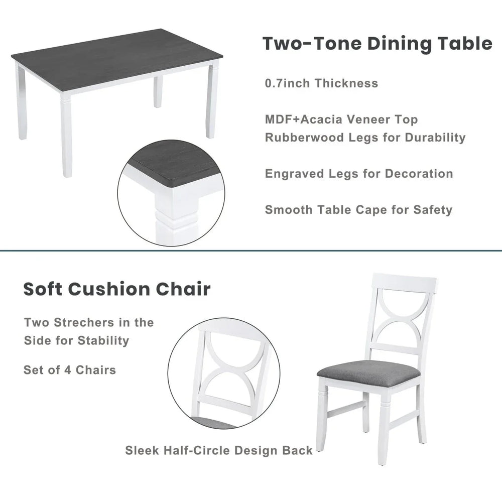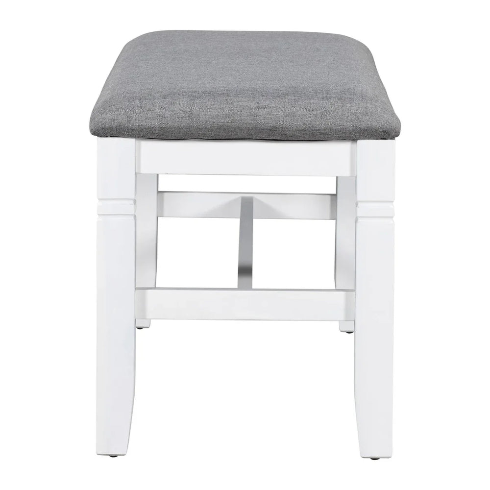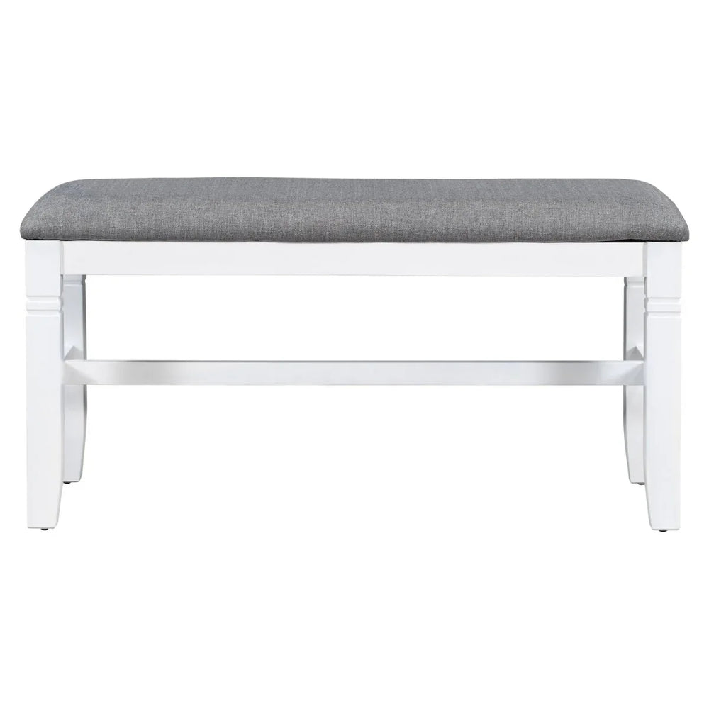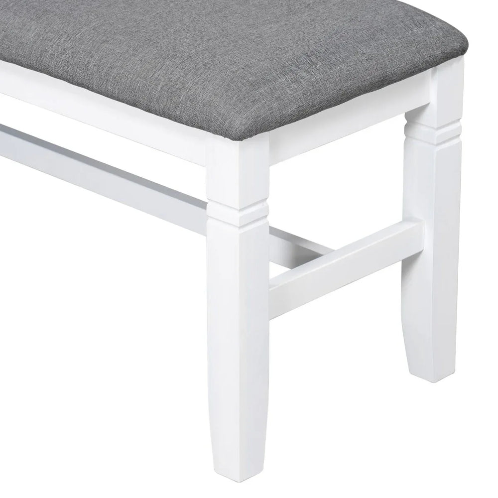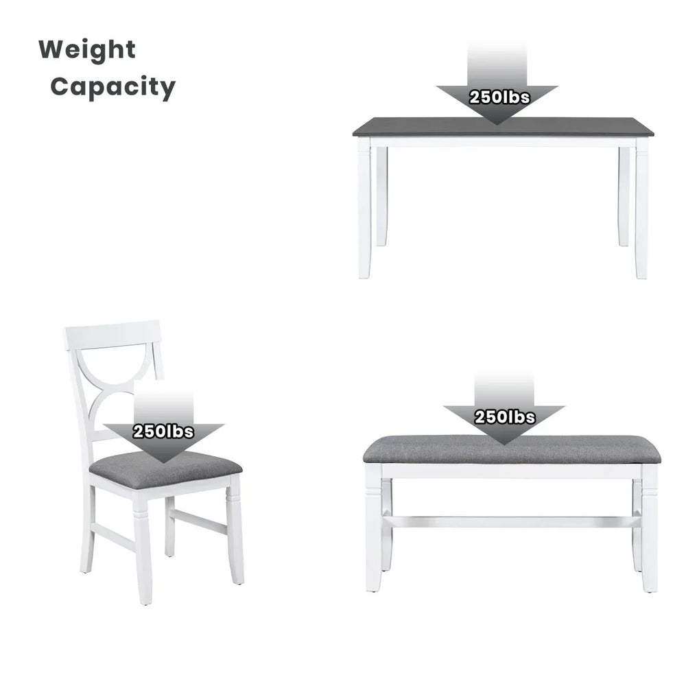 Create lasting memories with family and friends around this elegant 6-piece dining table set. Featuring a spacious 60 x 36 inch rectangular tabletop crafted from durable MDF with an acacia veneer finish, it offers ample space for meals and gatherings. The solid rubberwood frame and legs ensure long-lasting stability and strength, while the white frame and gray tabletop embrace a charming farmhouse style that complements any dining room décor. Four upholstered chairs and a matching bench provide comfortable seating with foam padding wrapped in soft linen fabric, allowing flexible arrangements for up to six people. Designed for easy assembly with all tools included, this set combines rustic beauty with practical functionality to enhance your home dining space.