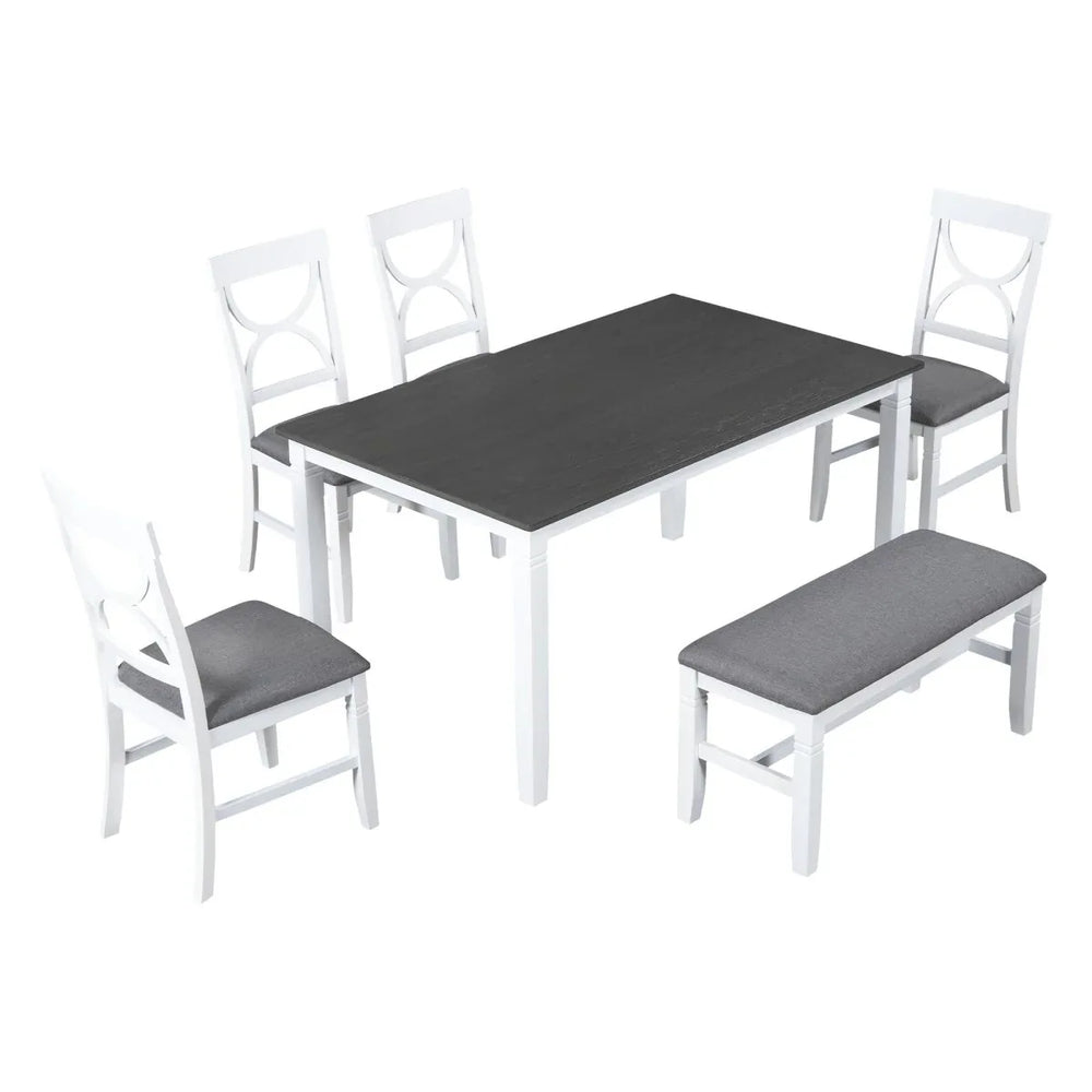 This 6-piece farmhouse dining set features a solid rubberwood frame with a gray wood tabletop, upholstered chairs, and a bench, seating up to six. Its durable construction and elegant design suit casual or formal dining spaces. Assembly required.