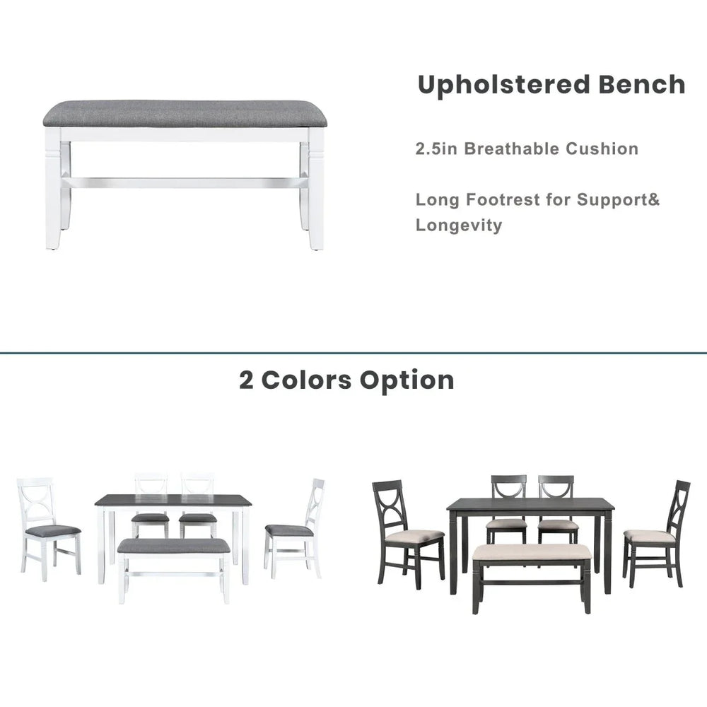 6-Piece Farmhouse Solid Wood Dining Table Set With Upholstered Bench