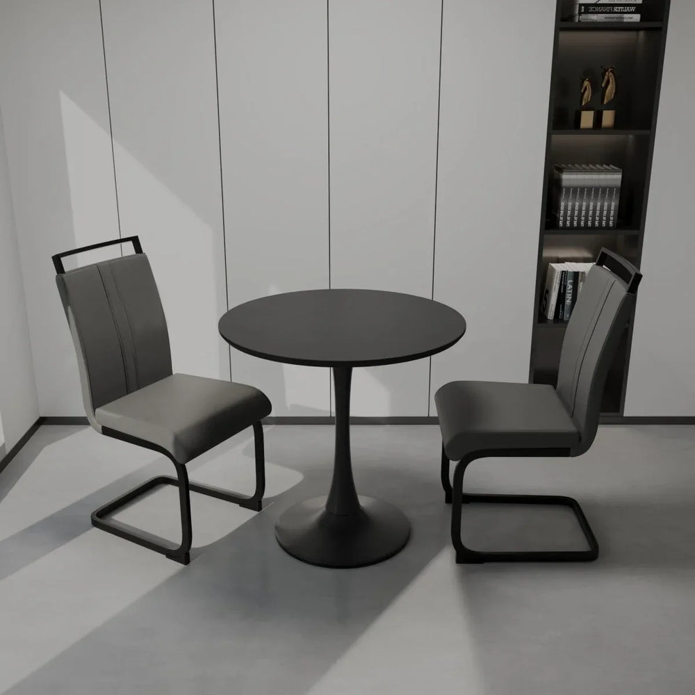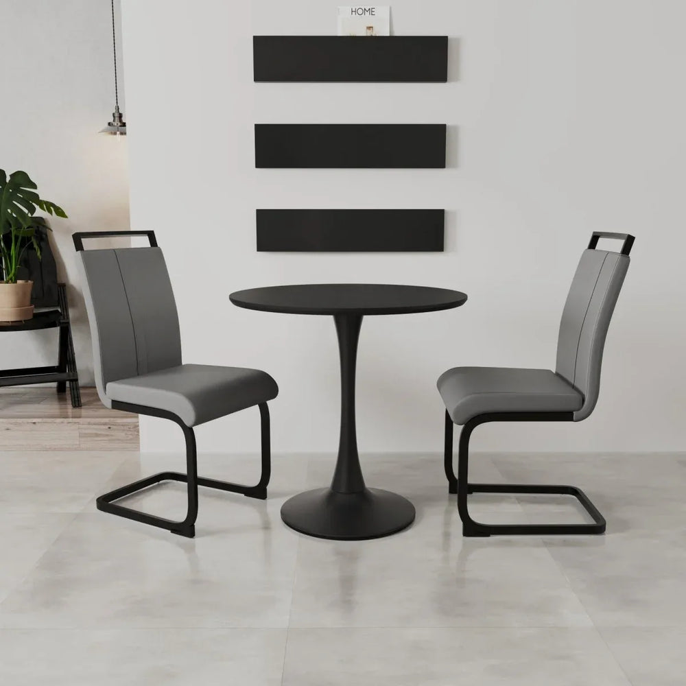 This black tulip dining table set includes a 31.5-inch round MDF table with sleek metal support and two gray PU leather chairs with metal legs, offering durable, ergonomic seating ideal for small dining spaces and contemporary home kitchens.