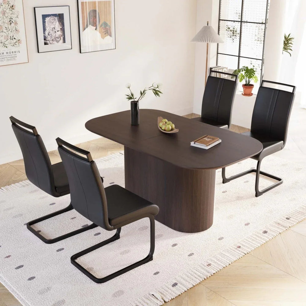 Elevate your dining space with this stylish 5-piece dining set, featuring a rich brown MDF table paired with four sleek black PU leather armless chairs. The table’s spacious design accommodates 4 to 8 guests comfortably, perfect for family meals and entertaining. Crafted from durable MDF with thick striped legs, the dining table offers a stain-resistant surface that’s easy to clean and maintain. The chairs combine modern industrial design with ergonomic comfort, supported by sturdy black metal legs and scratch-resistant feet to protect your floors. This set seamlessly blends medieval charm with contemporary style, making it an ideal centerpiece for both home and kitchen environments. Assembly is quick and hassle-free, so you can enjoy enhanced dining experiences sooner. Upgrade your home dining area and impress your guests with this versatile, fashionable dining set today.