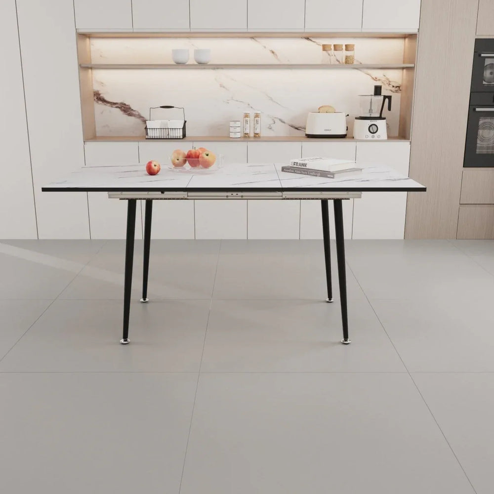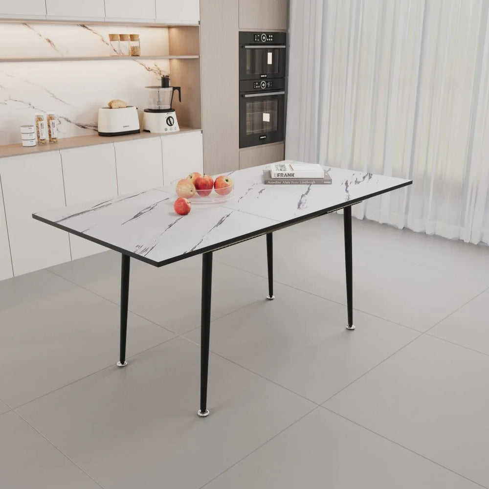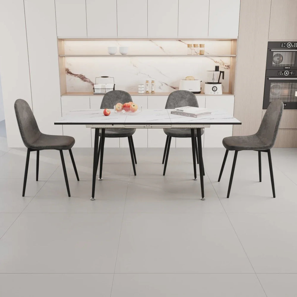Upgrade your dining space with this stylish and functional 4-piece dining set, featuring a sleek extendable MDF table with a striking marble-patterned white and grey surface. The black metal base adds industrial elegance and robust stability, while the smooth expandable tabletop effortlessly adjusts from 47 to 63 inches, accommodating intimate meals for 2-4 guests or lively gatherings up to 6. Paired with ergonomically designed suede chairs, this set combines comfort and contemporary style to make every meal a special occasion. Easy to clean and built for durability, it adapts perfectly to kitchens, dining rooms, or restaurants. Assembly is quick and simple, so you can enjoy a comfortable, fashionable dining area in minutes. Elevate your mealtime ambiance today.