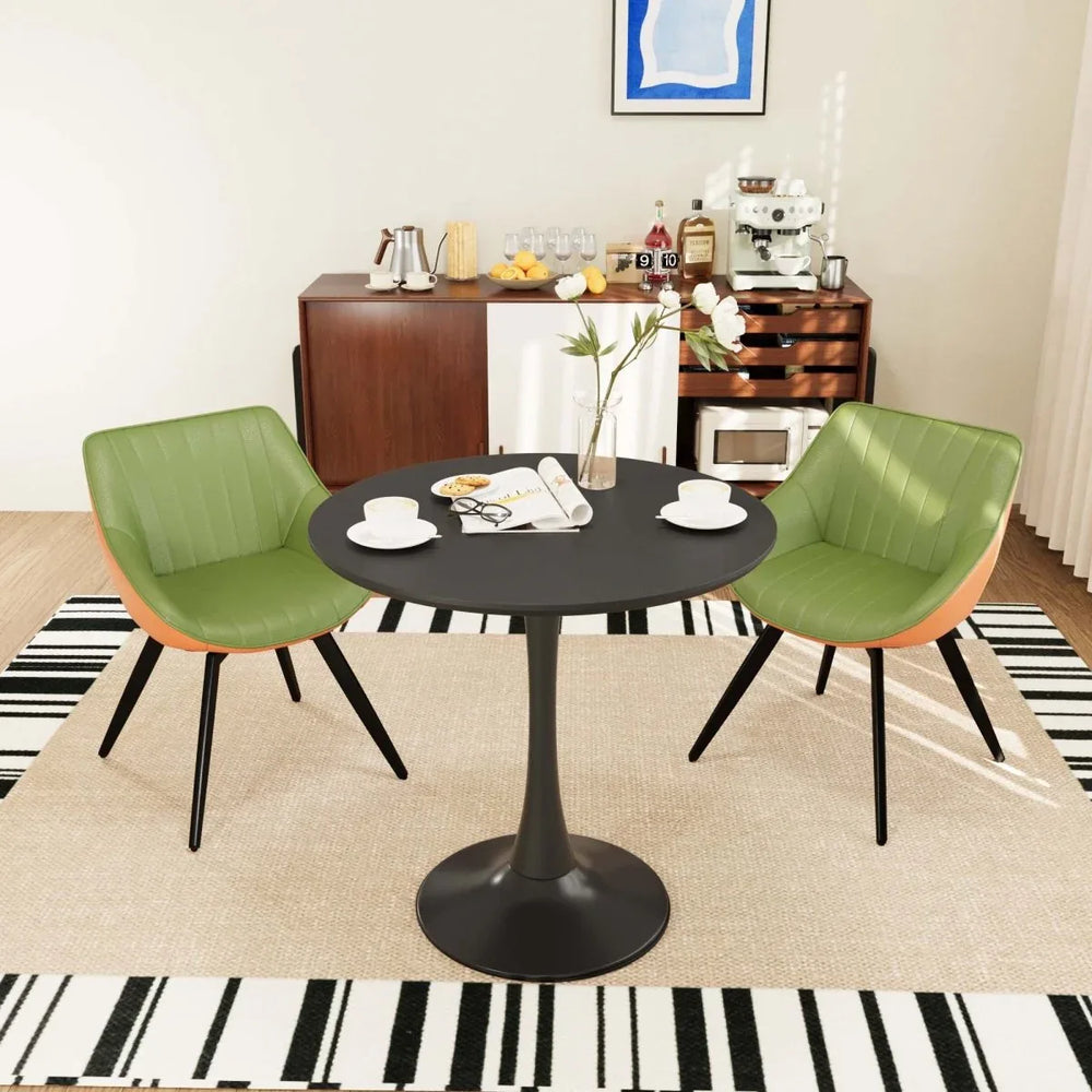 Bring style and comfort to your kitchen or dining area with this modern 3-piece set featuring a sleek 31.5-inch (80 cm) round dining table and two cushioned chairs. The table’s smooth MDF tabletop pairs beautifully with a sturdy black metal pedestal base, offering lasting durability and a minimalist silhouette ideal for 2-4 people. Complementing the table are two ergonomic chairs upholstered in premium black synthetic leather (PU) with plush high-density sponge padding, designed to provide exceptional comfort and back support during meals or long gatherings. Whether you’re hosting casual dinners or using the chairs in your office or living room, this versatile set ensures both functionality and contemporary style. Easy to assemble with included instructions and tools, this dining collection is the perfect addition to any modern home. Elevate your space today with this stylish and comfortable dining solution.