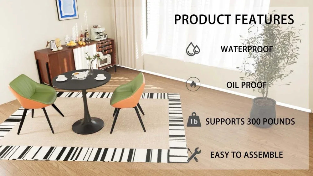 This 3-piece dining set features a sturdy black MDF round tulip table and two ergonomic synthetic leather chairs with cushioned PU seats for comfort and back support. Ideal for family meals or office seating, it blends modern style with versatile use.