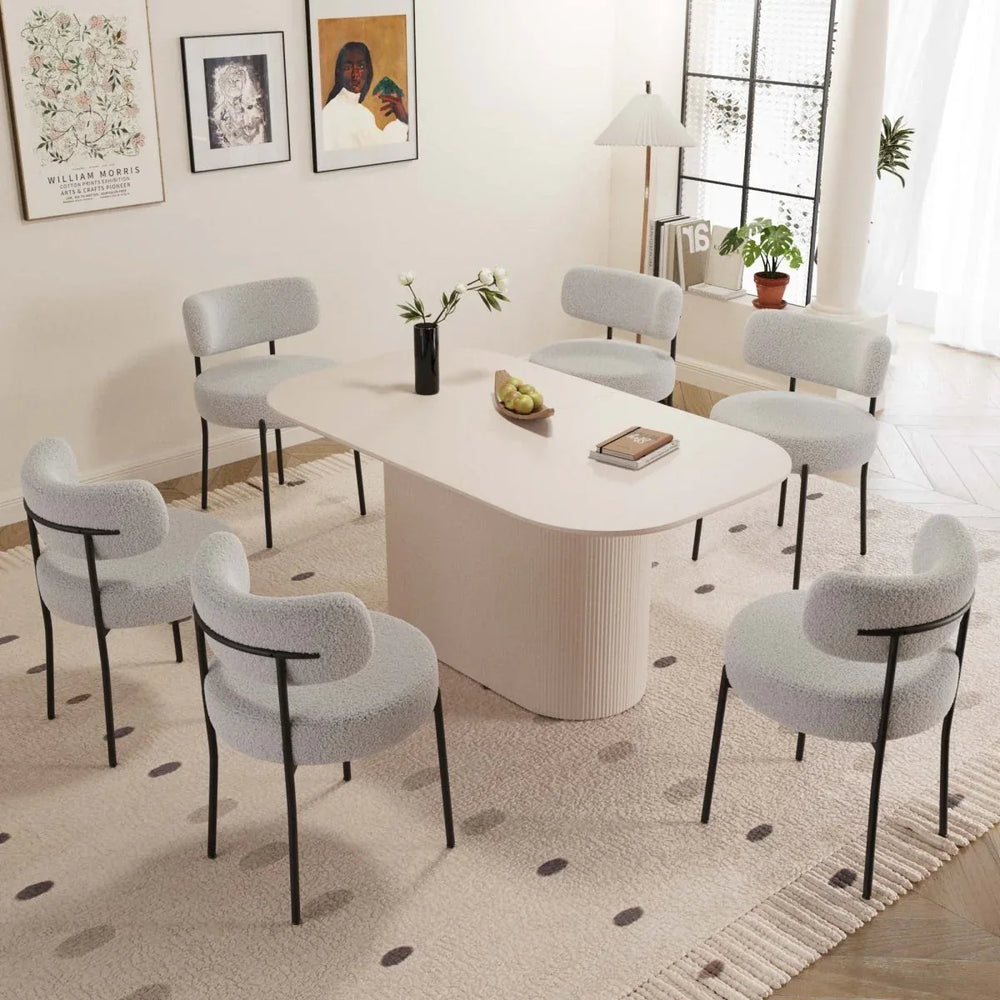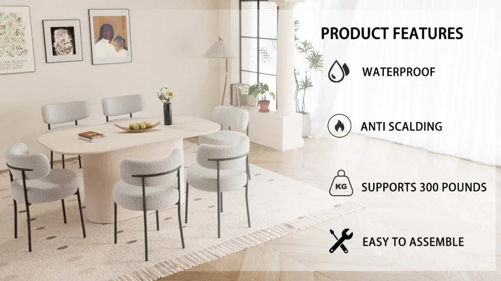 Modern cream MDF dining table with six curved-back dining chairs featuring thick high-density sponge cushions for comfortable seating. Stain-resistant tabletop supports family meals or gatherings, blending easily with various home and kitchen decor styles. Assembly tools and instructions included.