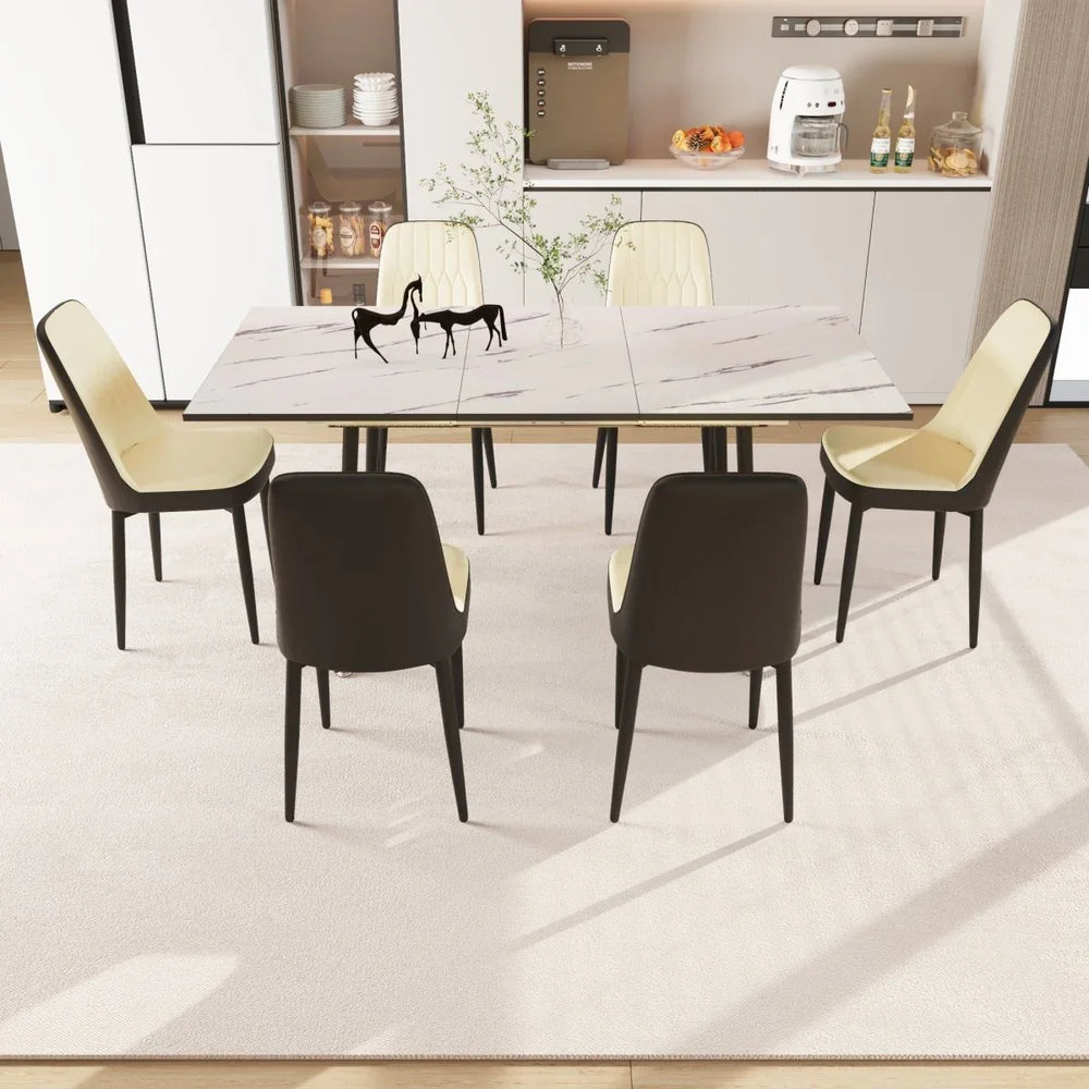 Upgrade your dining experience with this sophisticated 7-piece dining table and chair set, designed to comfortably accommodate 2 to 6 people. The spacious MDF tabletop features a smooth, jade-like finish with a natural beige and white pattern, pairing perfectly with sleek black metal legs that add a modern minimalist touch. The extendable table easily adjusts to create more room for guests, making it ideal for both everyday meals and special occasions. Each chair is carefully crafted with thick PU fabric cushions and a supportive backrest filled with plush doll cotton, ensuring lasting comfort during long dinners or work sessions. Anti-slip pads on the table legs enhance stability while protecting your floors. Easy to clean and simple to assemble, this versatile set combines style, durability, and function to elevate your home dining or office space. Elevate your space and enjoy effortless hosting today.
