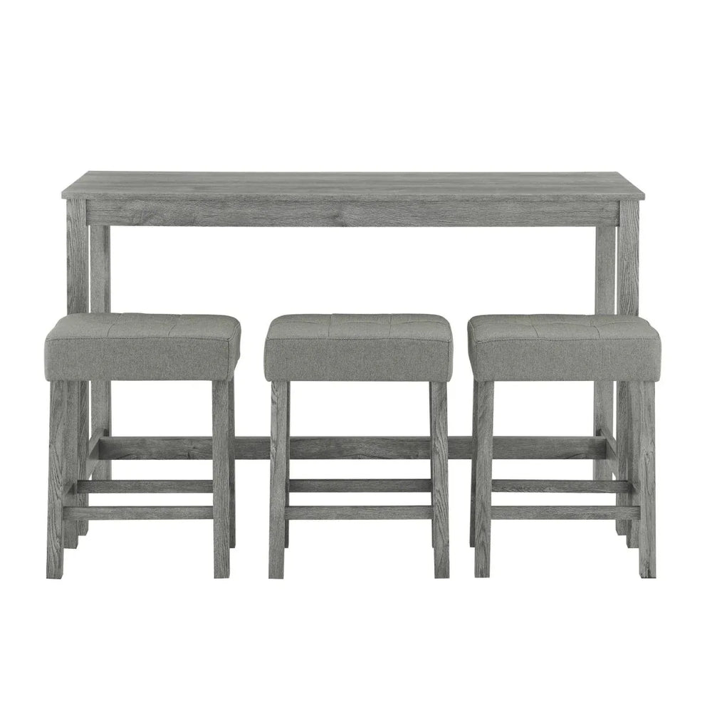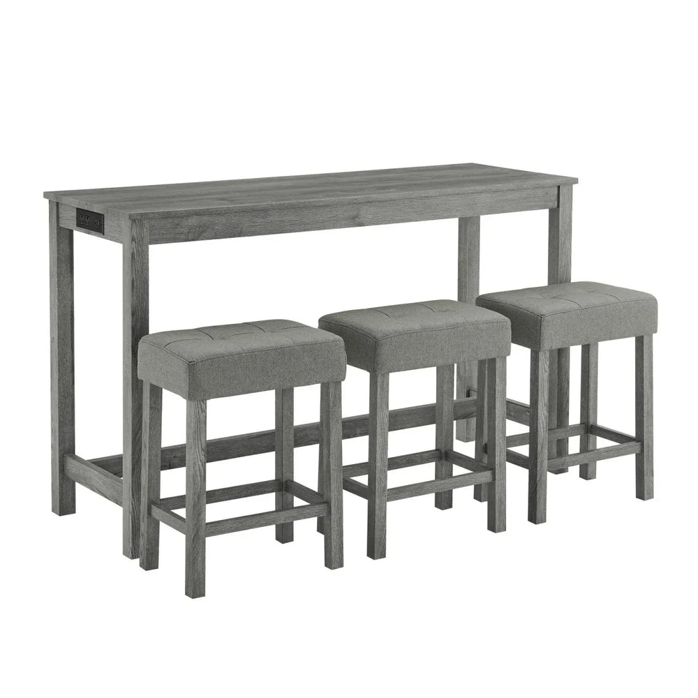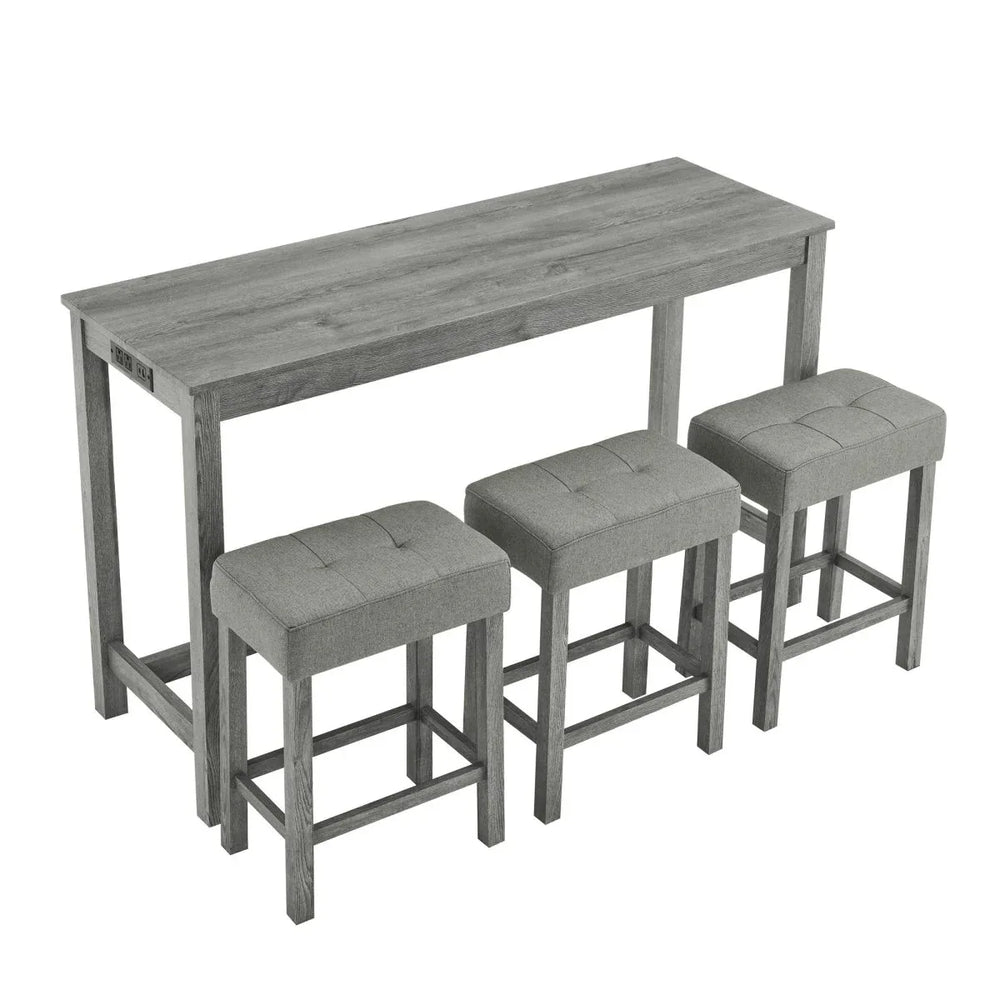 Designed for modern living, this 4-piece bar table and chair set combines style, convenience, and durability. Crafted from solid wood and MDF with a sleek grey finish, the 59-inch (5 ft) table offers a sturdy workspace or dining area ideal for kitchens, living rooms, or dining rooms. Integrated USB and Type-C ports alongside two AC power outlets allow seamless charging of your devices—perfect for work, meals, or entertaining guests. Three linen-upholstered stools with 24-inch seat height complement the set by providing comfortable, ergonomic seating. The space-saving design lets you tuck stools under the table, maintaining a neat area without sacrificing style. Resistant to scratches, heat, and spills, this industrial farmhouse-inspired set makes everyday use both practical and stylish. Upgrade your home setup with this versatile bar set today.