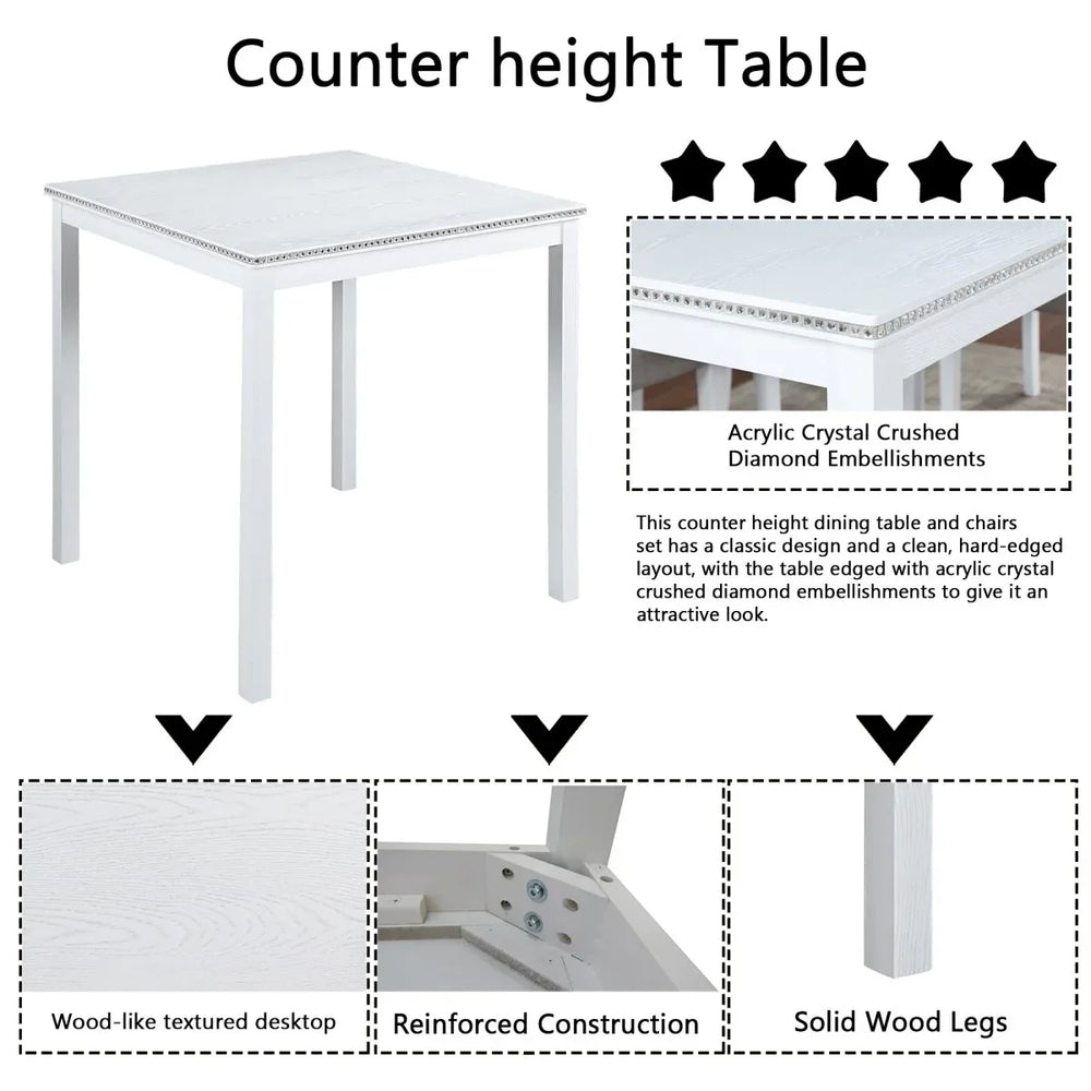 Upgrade your kitchen or dining room with this stylish 5-piece counter height dining set featuring a square table and four upholstered chairs. Crafted from durable solid wood and high-quality MDF, the tabletop showcases a beautiful faux wood grain finish that adds warmth and sophistication. The table edges are adorned with dazzling acrylic crystal crushed diamond accents, creating a subtle yet striking focal point. Designed for comfort and functionality, the four chairs combine sturdy solid wood frames with plush foam-padded seats and backrests, making every meal relaxing. Compact yet spacious, this set fits perfectly in smaller dining areas while providing ample legroom. With a weight capacity of up to 330 lbs per chair and table, it promises lasting stability and support. Easy to assemble and maintain, this dining set is the perfect blend of modern elegance and practical comfort. Make every meal special—bring home this exquisite dining set today.