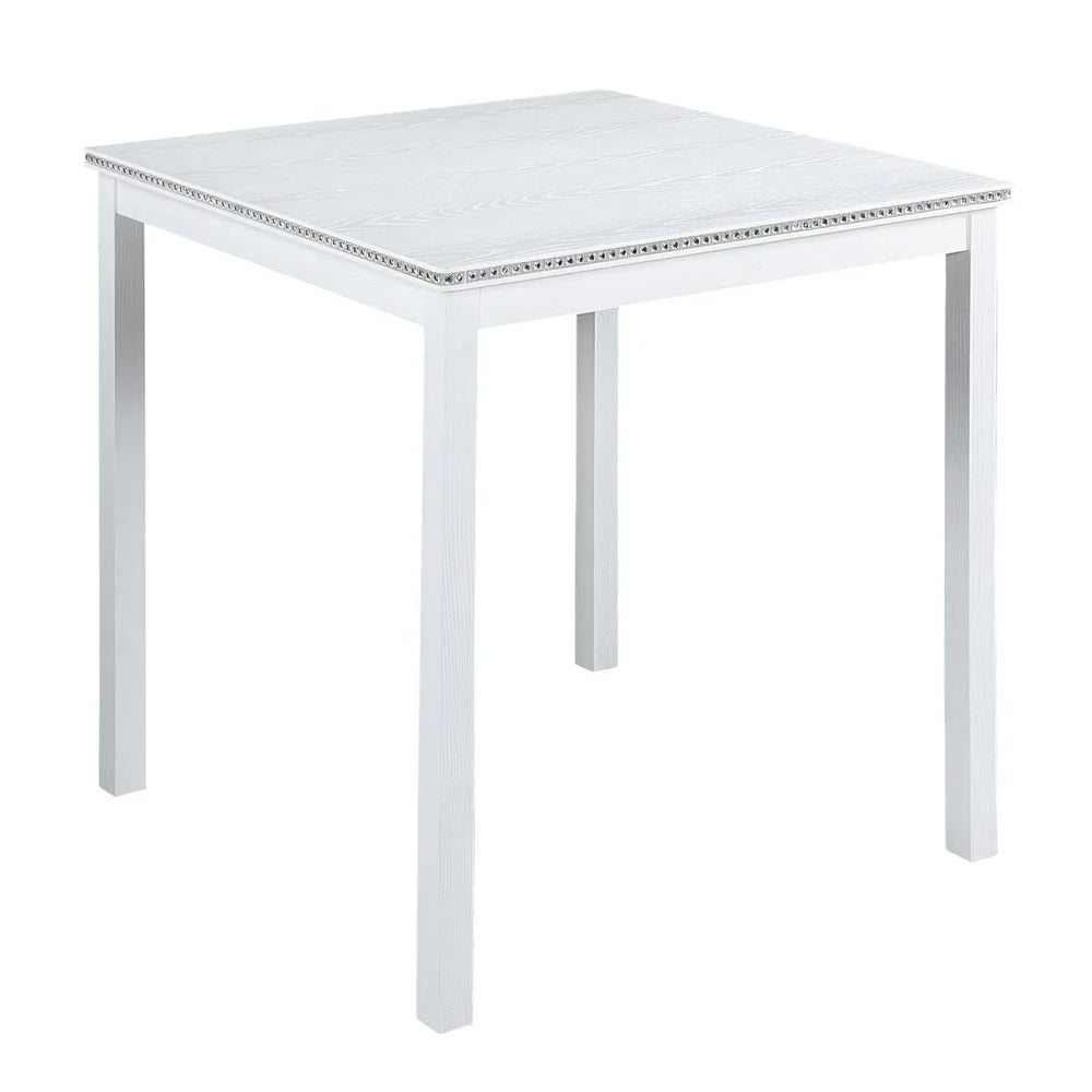 • Square tabletop design measures 34.5 inches with crystal decorated edges