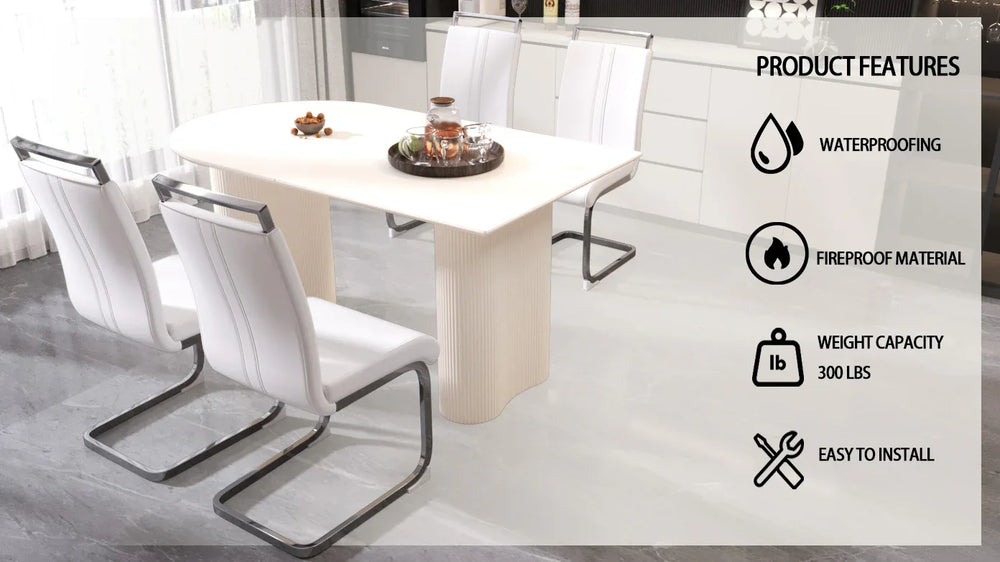 Bring timeless elegance and modern comfort to your home with this 5-piece dining table and chair set. Crafted from durable MDF with a creamy white finish, the spacious table features thick, wavy legs that add a unique medieval modern flair while providing sturdy support for gatherings of 4 to 8 guests. Complemented by four ergonomically designed armless chairs upholstered in easy-to-clean PU leather and supported by stylish silver-plated metal legs, this set blends fashion and function effortlessly. The stain-resistant tabletop ensures hassle-free maintenance, perfect for busy family dinners or entertaining friends. Designed to fit seamlessly into various interior styles—from contemporary to traditional—this dining set transforms your space into a warm and inviting hub. Assembly is quick and simple with included instructions and tools. Elevate your home dining atmosphere today.