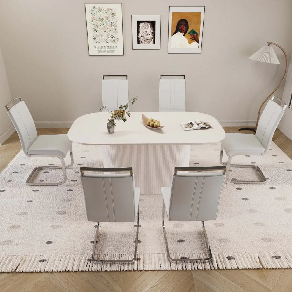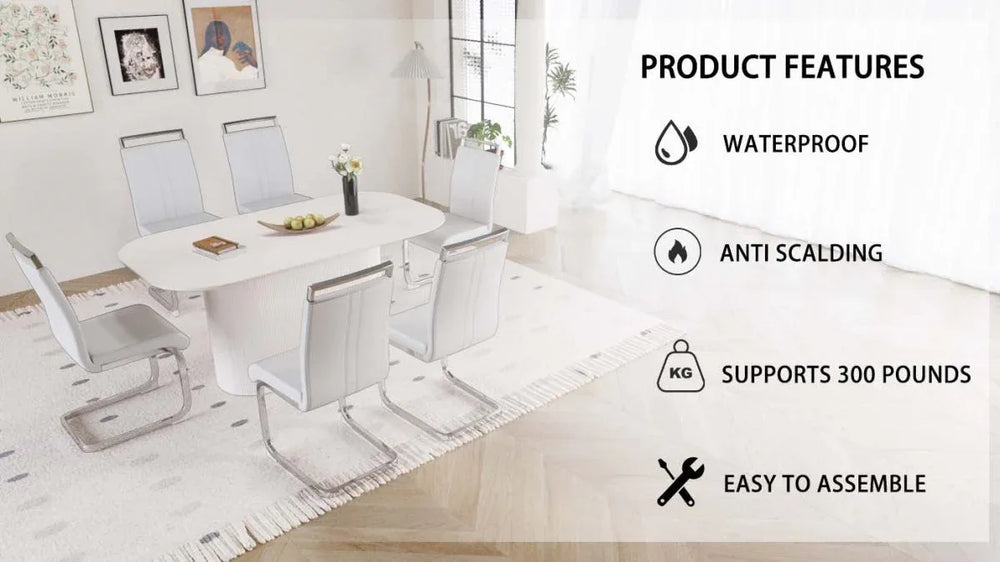 Bring timeless elegance and contemporary comfort to your home with this 7-piece dining table and chair set. Crafted from durable MDF with a creamy white finish, the spacious dining table features thick striped legs that evoke a medieval yet modern aesthetic, making it a stunning focal point in any dining area. Paired with six ergonomically designed armless chairs upholstered in soft PU leather, this set ensures stylish seating for 4 to 8 guests, perfect for family dinners and gatherings. The silver-plated metal legs add a touch of industrial charm while providing sturdy support. Easy to assemble with included instructions and tools, this dining set blends form and function seamlessly to enhance your home and kitchen ambiance. Upgrade your dining space today and enjoy comfort and style every meal.