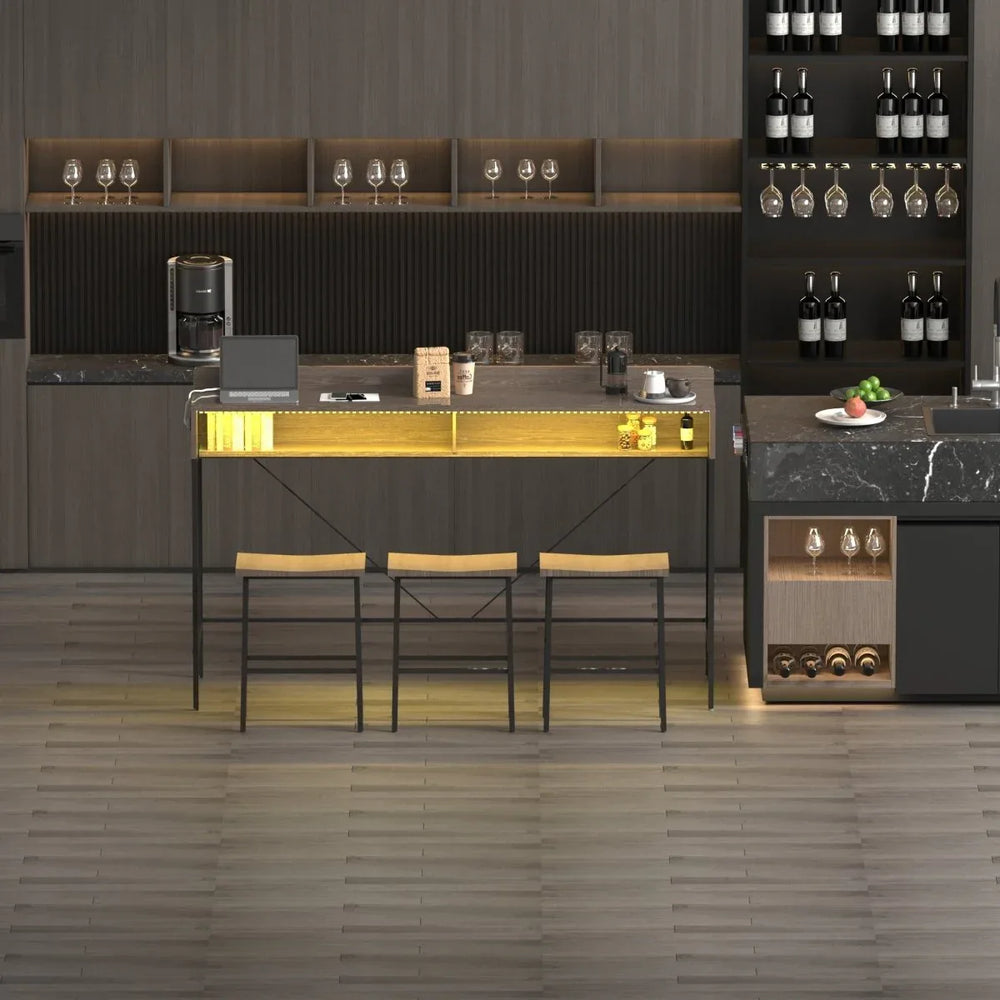 This 59-inch farmhouse-style sofa table set features a sturdy MDF and iron construction, ergonomic saddle stools, ample double-layer shelving for storage, built-in USB, Type-C, and AC outlets, plus six-color LED mood lighting, ideal for living room or kitchen use.