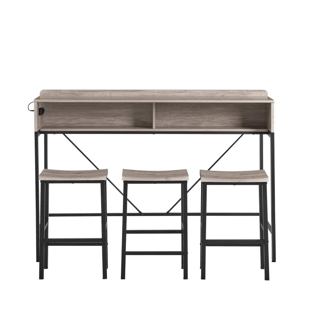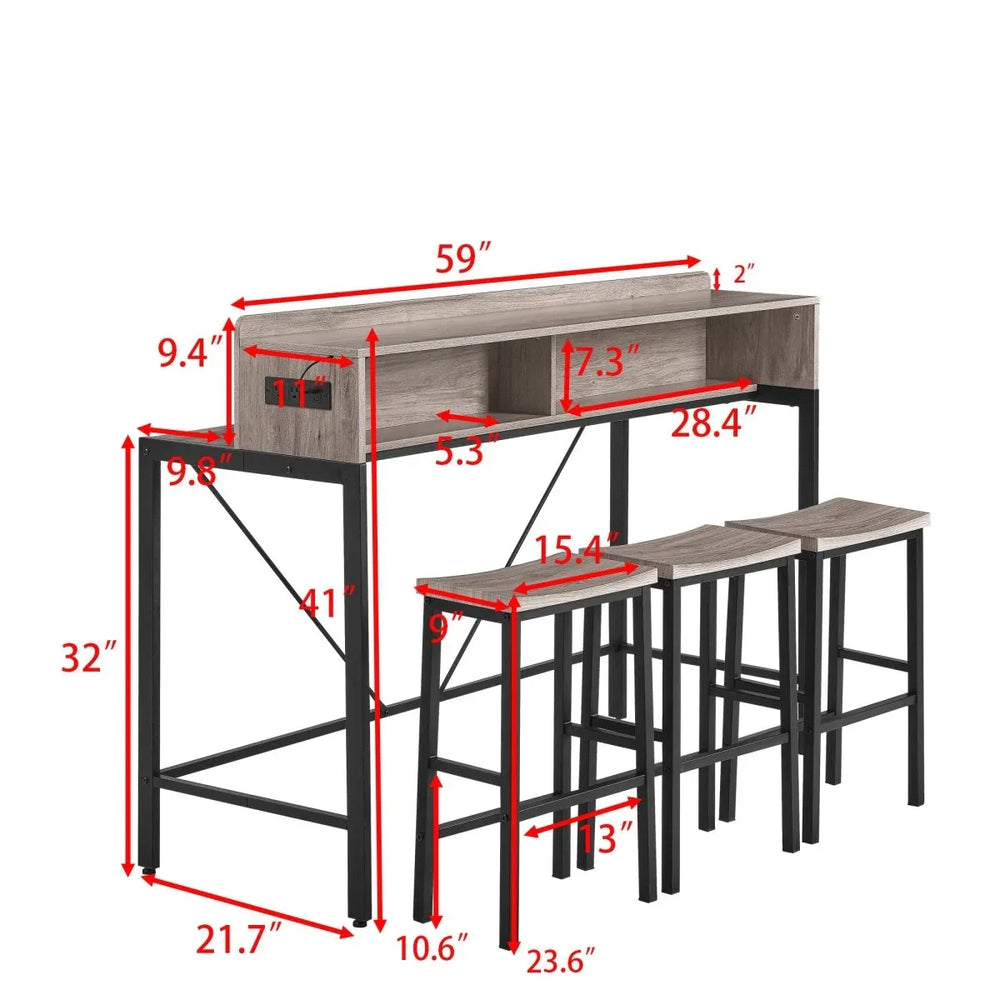 Enhance your living room, dining area, or kitchen with this versatile 4-piece bar table and stools set. Designed as a stylish farmhouse-style sofa table, it perfectly fits behind your sofa to create additional lounging, dining, or workspace. Crafted from durable MDF and iron, this grey console features a sturdy steel frame combined with E1 grade high-density fiberboard, offering scratch-resistant, waterproof, and wear-resistant surfaces. The double-layer ladder shelves provide ample space for décor, laptops, or essentials, while the three ergonomic saddle stools with curved panels ensure comfortable seating that helps reduce fatigue. Built-in power outlets, including USB, Type-C, and AC plugs, plus a colorful LED mood light strip, keep your devices charged and add ambiance. Quick to assemble and maintain, this compact bar table and chair set is the perfect blend of function and modern farmhouse charm. Elevate your home setup today.