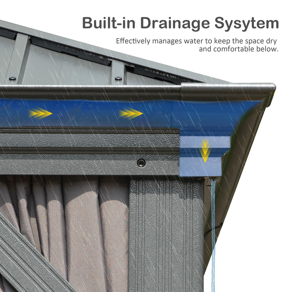 Enhance your outdoor living space with this sturdy 12-foot by 16-foot hardtop gazebo, designed to provide year-round protection and style. Crafted from a robust aluminum frame and a galvanized steel double roof canopy, it offers exceptional resistance against harsh weather, including snow loads and strong winds. The unique double roof design promotes optimal air circulation and insulation, ensuring comfort in both heat and cold. Equipped with convenient curtains and netting, this grey gazebo shields you from sun exposure and pesky insects while providing privacy for gatherings or quiet relaxation. Whether hosting outdoor events, enjoying family meals, or creating a tranquil retreat, this versatile gazebo transforms your patio, deck, or garden into an inviting haven. Easy to install and maintain, it’s the perfect combination of function and elegance to elevate your outdoor experience. Elevate your relaxation today.