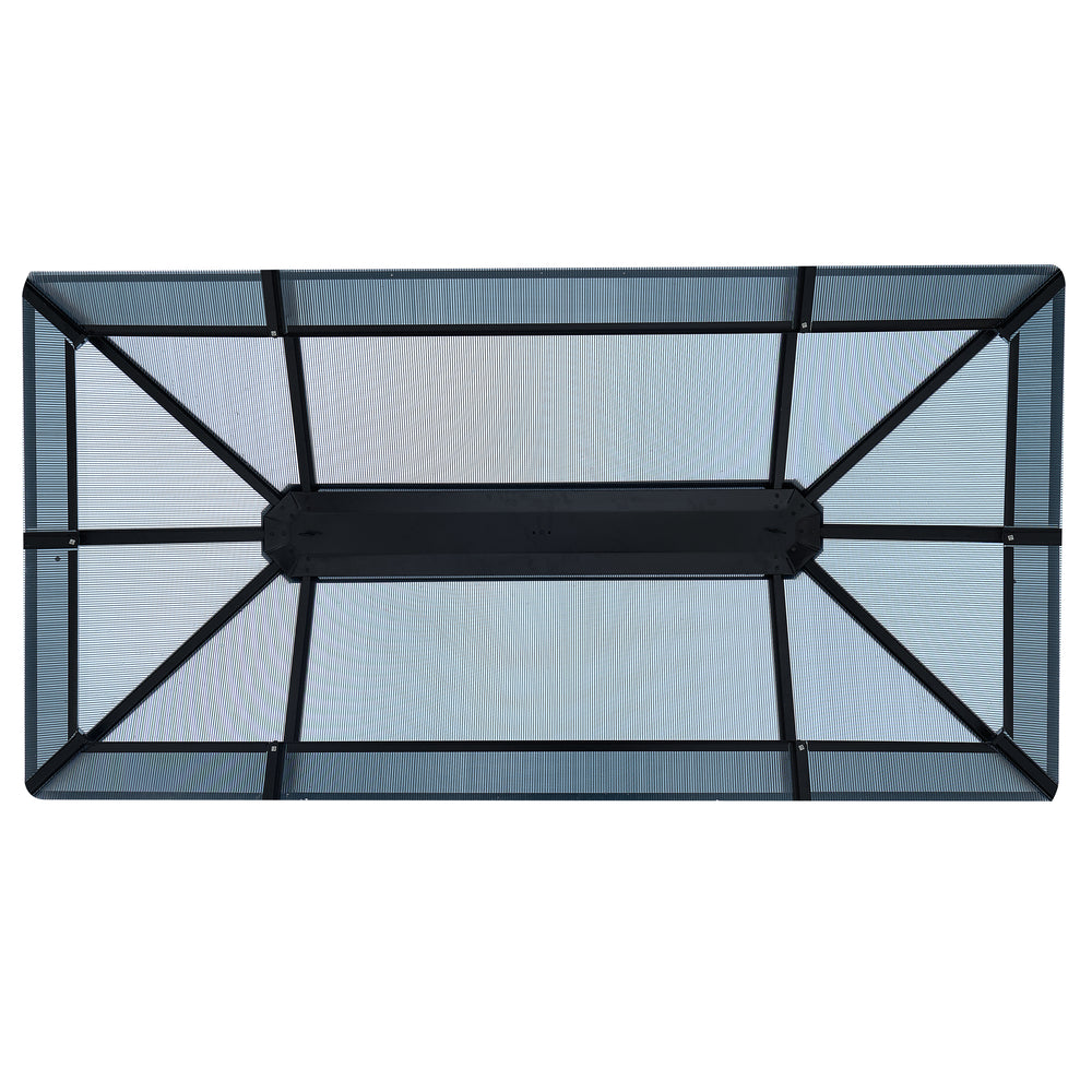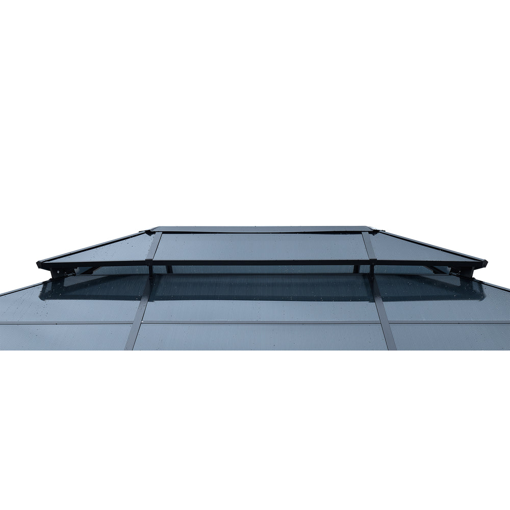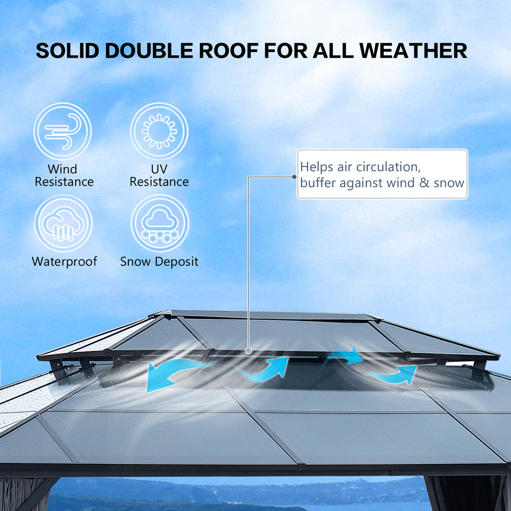 Elevate your garden, patio, or lawn gatherings with this spacious 12 by 16-foot gazebo featuring a durable steel frame and a triple-layer polycarbonate hardtop. Designed to block 99% of harmful UV rays, the double roof canopy allows natural light while reducing heat, keeping you cool and shaded even on the hottest days. Fully enclosed with zippered netting and curtains, it offers privacy and protection against bugs and harsh weather. The ventilated double top design promotes airflow by letting wind pass through, ensuring enhanced comfort. Easy-to-follow pictographic instructions make assembly straightforward, so you can quickly create a stylish, permanent pavilion perfect for parties, relaxation, or outdoor dining. Transform your outdoor space today and enjoy lasting shade and shelter in a sleek grey design that complements any setting.