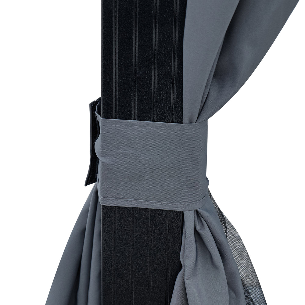 Outdoor gazebo with durable steel frame and grey polycarbonate double roof offers UV protection blocking 99% harmful rays, ventilated design for airflow, and zippered netting with curtains for privacy and insect protection, ideal for garden or patio relaxation.