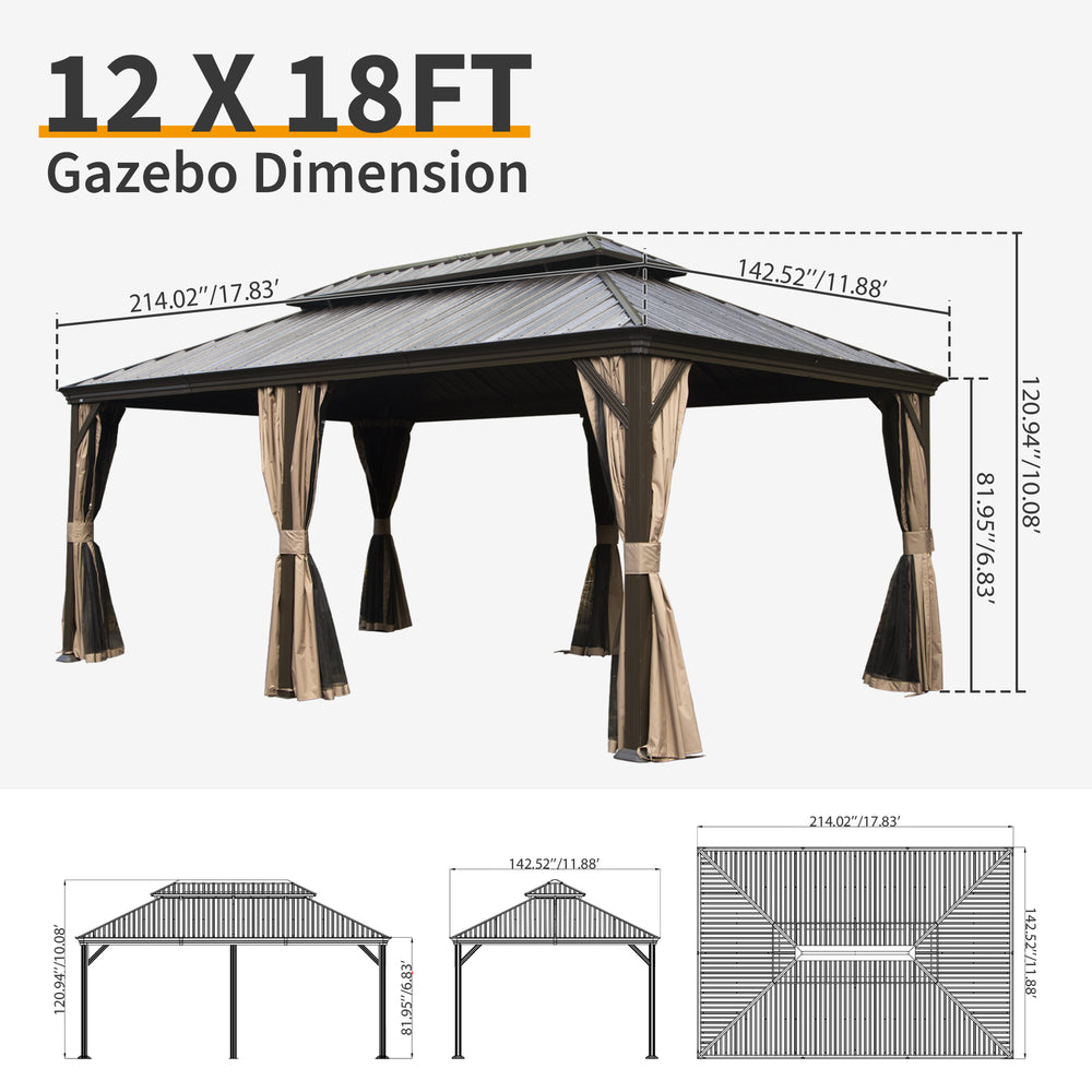 Upgrade your outdoor living area with this spacious 12-foot by 18-foot hardtop gazebo, designed to combine style, durability, and functionality. Crafted from sturdy aluminum and metal with a dual-layer galvanized steel roof, it offers superior protection from the elements all year round. The built-in drainage system efficiently channels rainwater away, keeping your outdoor space dry and inviting. Thanks to fade-resistant curtains and breathable netting, enjoy privacy, UV protection, and a mosquito-free environment for relaxed gatherings, meals, or quiet moments in your patio, garden, or backyard. With ample space and versatile hooks for lighting or fans, this gazebo transforms your outdoor area into a personal retreat that adapts to your lifestyle. Elevate your outdoor experience today with this reliable and elegant shelter solution.