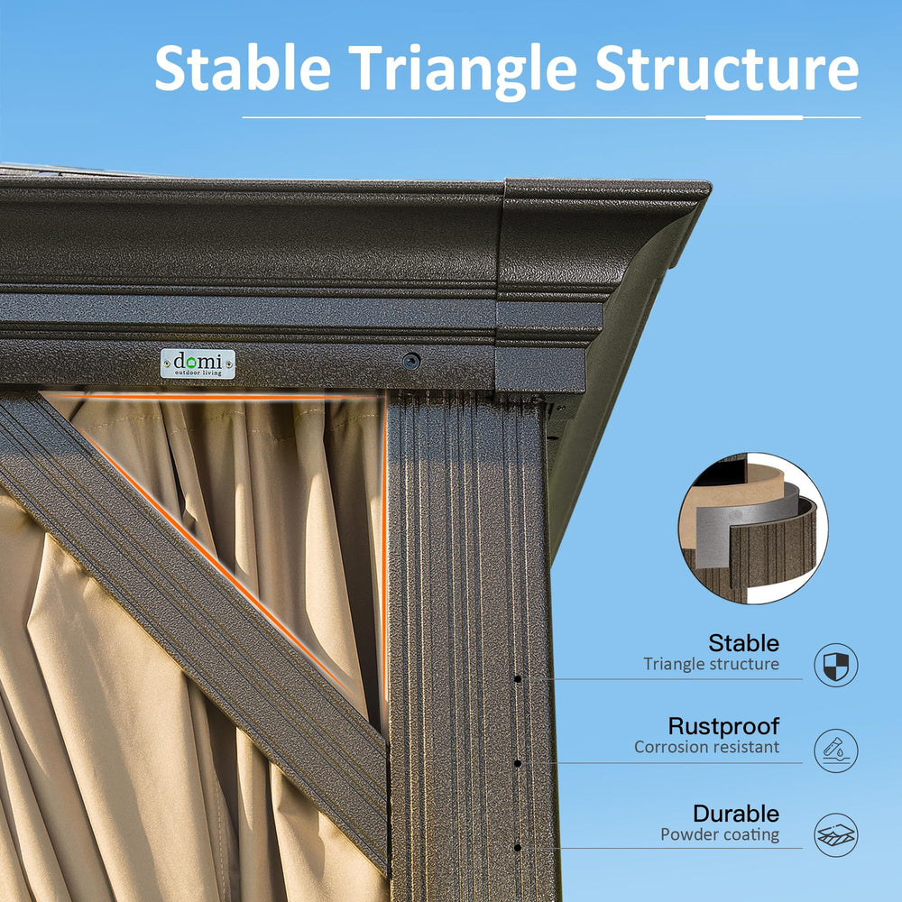 Omega Lifestyles hardtop gazebo features a durable aluminum and metal frame with a galvanized steel roof, built-in drainage, UV protection, mosquito netting, and adjustable curtains, offering a spacious, weather-resistant outdoor shelter ideal for year-round backyard relaxation and entertainment.