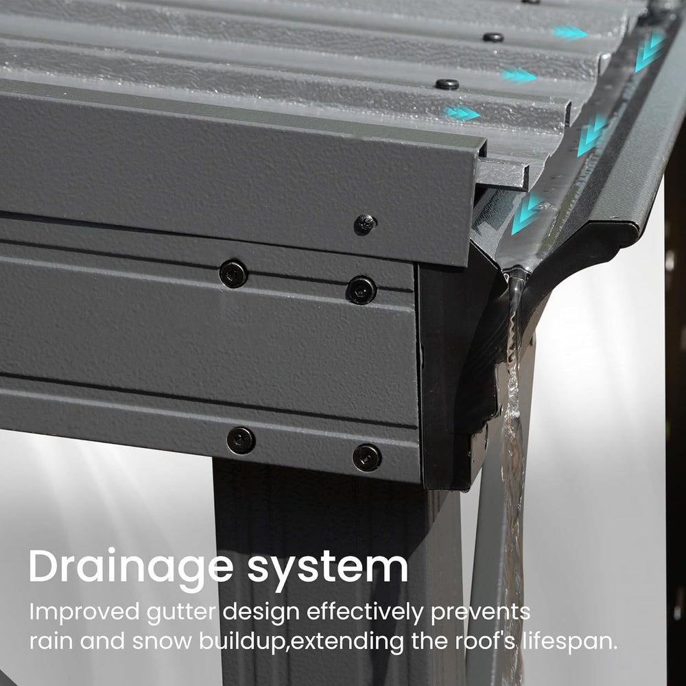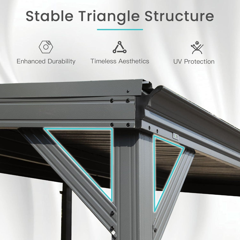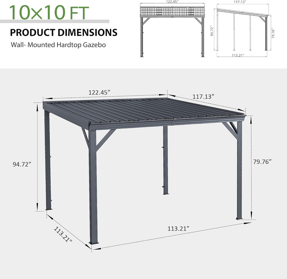 Create a stylish and functional outdoor retreat with this modern wall-mounted gazebo, designed to offer durable shelter and year-round comfort. Crafted from sturdy metal with a galvanized steel hardtop roof, it protects you from rain and harmful UV rays while maintaining a sleek, contemporary look. The spacious 10 by 10-foot (120" x 120") footprint provides ample room for gatherings, lounging, or dining in your backyard, porch, or deck. Its innovative built-in drainage system efficiently channels water away to prevent pooling and structural damage, reducing maintenance and extending the life of your outdoor shelter. Weighing over 212 pounds, this robust gazebo stands strong against various weather conditions, making it a perfect addition for garden and outdoor enjoyment. Elevate your outdoor experience today with this reliable and elegant patio shelter.