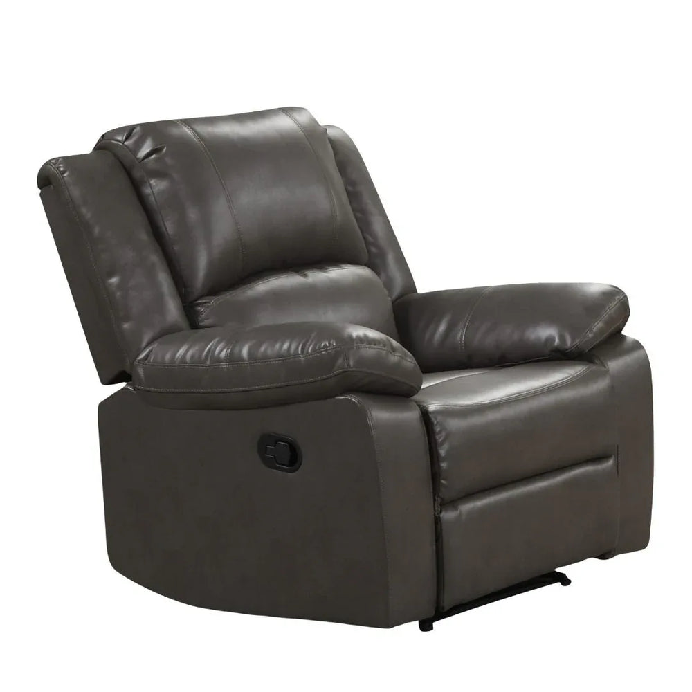 Relax in style with this transitional glider recliner that perfectly blends modern elegance and exceptional comfort. Upholstered in breathable gray leatherette, it offers the luxurious look of leather with easy maintenance and lasting durability. The pillow-top arms provide plush softness for your arms, while the padded back and seat cradle you in comfort during extended sitting sessions. Crafted with solid wood construction, this recliner ensures stability and long-lasting support in your primary living space. Measuring a compact 38 inches wide by 37.5 inches deep and 39 inches high, it fits seamlessly into any room or reading nook. Whether enjoying a book, watching TV, or simply unwinding, this glider recliner offers smooth reclining and gentle gliding motion for ultimate relaxation. Easy to assemble and designed for everyday use, it’s the perfect addition to elevate your living room today.
