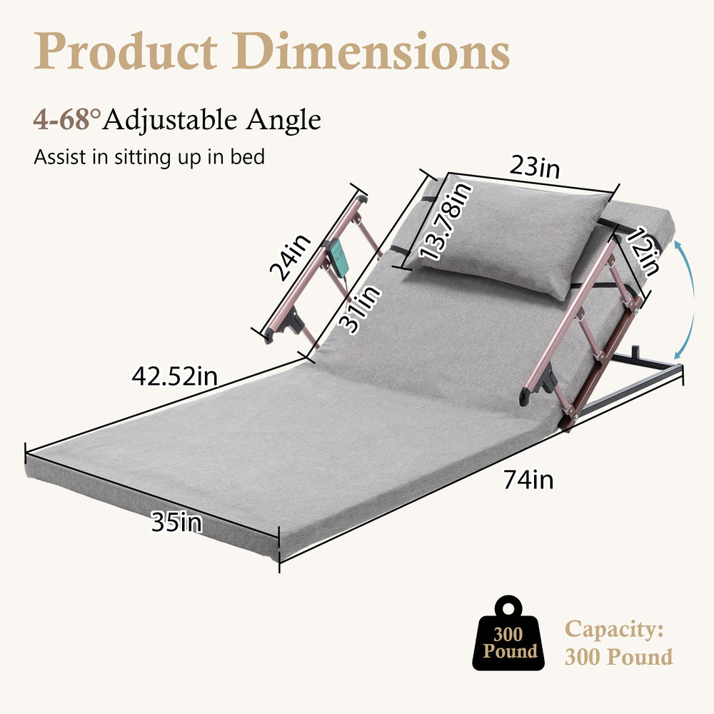 Enhance your rest and relaxation with this electric adjustable bed backrest, expertly crafted to support daily activities such as reading, watching TV, or sleeping. Featuring a smooth reclining system that adjusts from 4° to 68°, it offers personalized upper body support to ease pressure and improve posture. Built with a heavy-duty steel frame and high-resilience foam padding, this backrest provides stable, long-lasting comfort for users up to 300 lbs. The collapsible safety rails ensure secure positioning on any standard mattress, while the simple two-button remote lets you adjust angles effortlessly. Its breathable, machine-washable cover adds convenience, and the adjustable pillow delivers customized neck and head support. Ideal for elderly, pregnant women, patients, or anyone needing enhanced bed comfort and mobility assistance. Elevate your in-bed experience today with this versatile adjustable backrest.