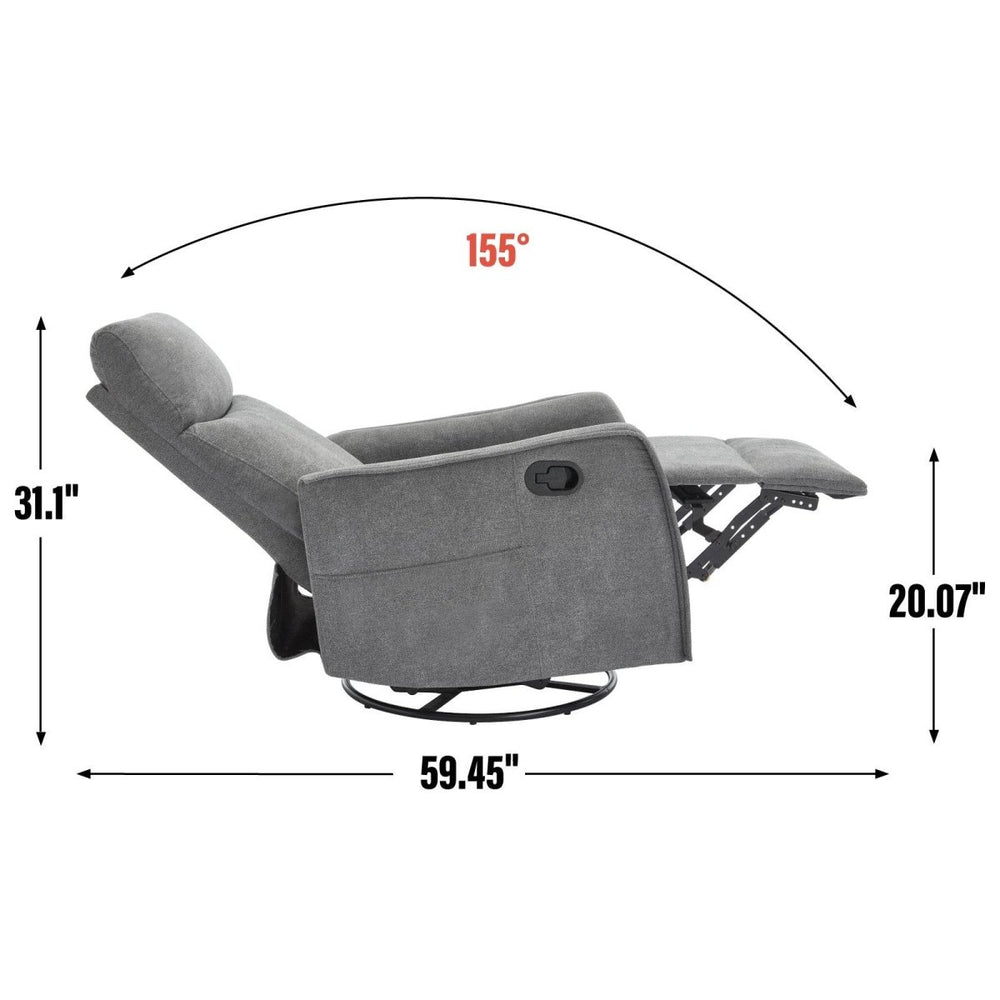 Unwind in your living room with this versatile grey recliner chair that combines comfort, massage, and style. Crafted with a sturdy metal frame and white pine wood accents, the chair features soft polyester upholstery and fiber foam padding for medium-firm support. Enjoy the soothing 8-point vibrating massage targeting your back, lumbar, thighs, and legs, complemented by a warming lumbar heat function that promotes blood circulation and deep relaxation. The manual handle lets you recline smoothly up to 155 degrees to find your perfect lounging position. Its black metal base enables both a gentle rocking motion and a 360° swivel, making this chair a functional centerpiece for any primary living space. Easy to assemble without tools, it fits seamlessly into American design-inspired interiors. Elevate your comfort and relaxation today with this multipurpose massage recliner.