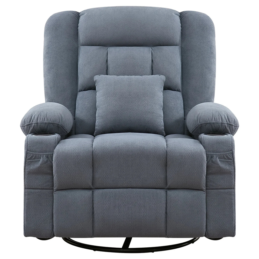Unwind in your living room with this modern Kneading Massage Rocker Recliner Chair, designed to melt away stress and tension. Featuring an advanced 4-point 3D kneading massage with three rotation speeds and customizable timing, it targets key muscle areas to relieve fatigue. The built-in heated seat enhances deep relaxation, while the soft, plush upholstery cradles your body with complete comfort. Its versatile design includes a 360° swivel and gentle rocking motion, perfect for soothing moments. Easily adjust the recline up to 150°, ideal for reading, watching TV, or napping. With convenient cup holders, side storage pockets, and a USB charging port, everything you need is at your fingertips. Crafted with a durable metal frame and plush padding, this chair supports your neck, back, and waist for all-day comfort. Elevate your living space and relaxation today.