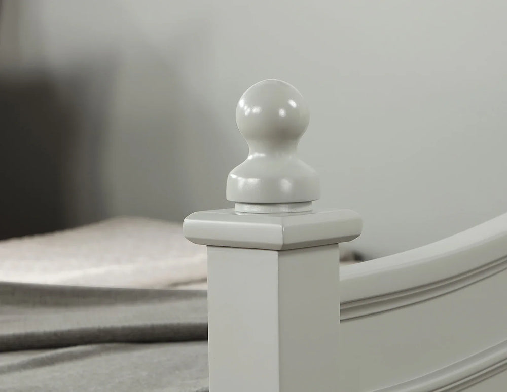 Transitional twin daybed features solid and engineered wood construction with molding details and finials for a classic look. Mattress ready and light gray finish make it ideal for guest rooms, offering versatile seating and sleeping space with simple assembly.