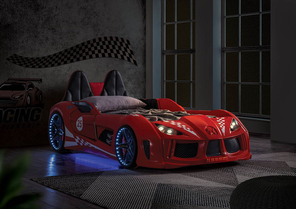 Fuel your child's imagination with this striking red race car bed, designed to bring excitement and comfort to any bedroom. Crafted from durable ABS and upholstered leatherette, the sleek modern design features a padded headboard and sides shaped like racing seats for added support and style. Embedded LED lights in the wheels and base create a thrilling glow, while the headlights double as convenient night lights to ease bedtime fears. Realistic magnetic doors open and close smoothly, offering fun interaction and enhancing the novelty appeal. With a wireless remote control, kids can enjoy four sound options that transform bedtime into an exciting adventure. Designed to fit a standard twin mattress (max 8 inches height), this bed is ready for restful sleep and imaginative play. Easy to assemble and built to last, it’s the perfect centerpiece for any young racing enthusiast’s room. Elevate your child’s sleep experience today.
