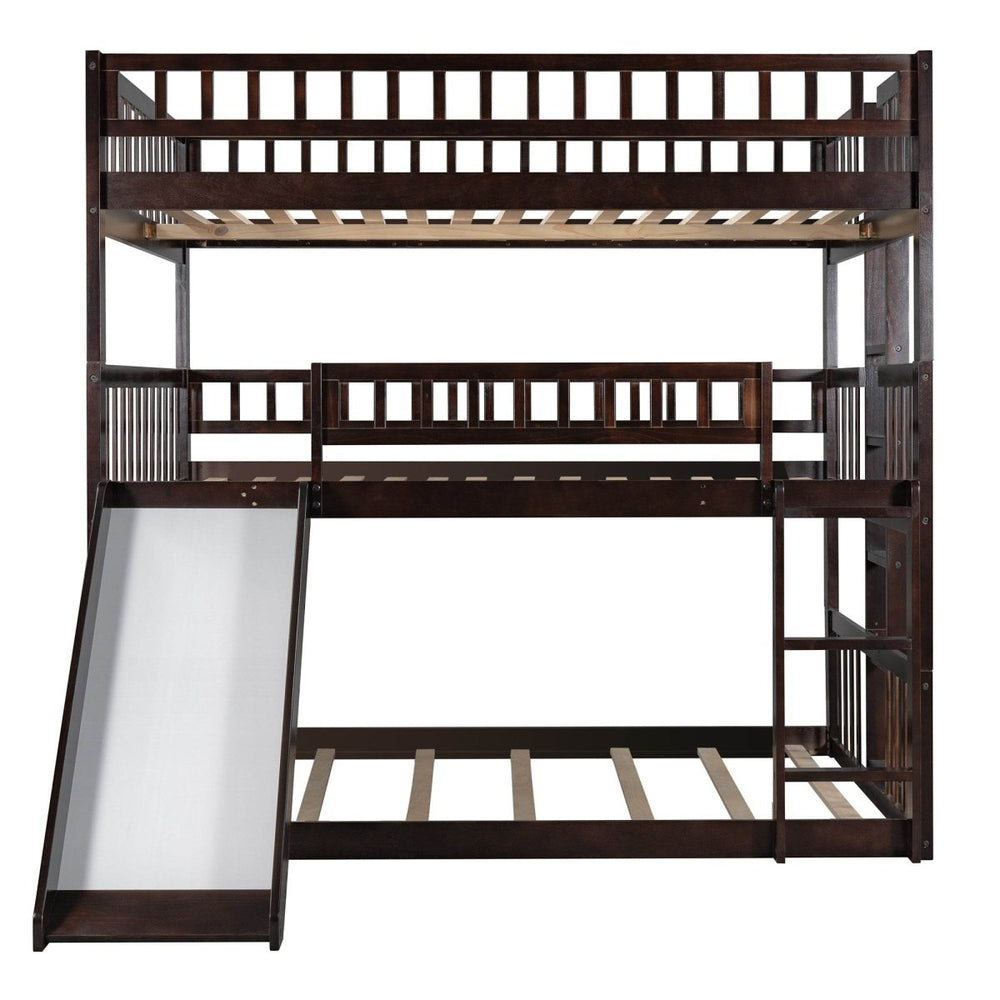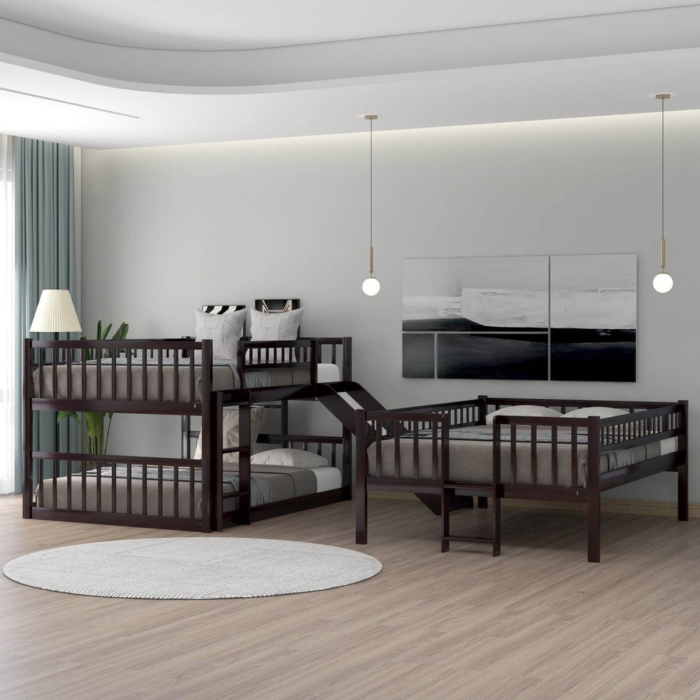 This versatile triple bunk bed is perfect for large families or those who frequently host sleepovers. Crafted from durable pine wood and plywood, it boasts a sturdy construction that resists cracking and warping. The espresso finish offers a modern touch that complements any bedroom decor. Designed to optimize vertical space, it combines three full-size beds in one footprint, freeing up valuable floor area for other furniture or play space. With two built-in ladders and strong guardrails, safety and easy access are ensured on the upper and middle bunks. A convertible low slide adds fun and encourages balance and coordination. For flexibility, this triple bed can be separated into three individual full beds or configured as a full-over-full bunk setup. Assembly is required, with clear instructions provided. Elevate your bedroom organization and sleeping capacity today.