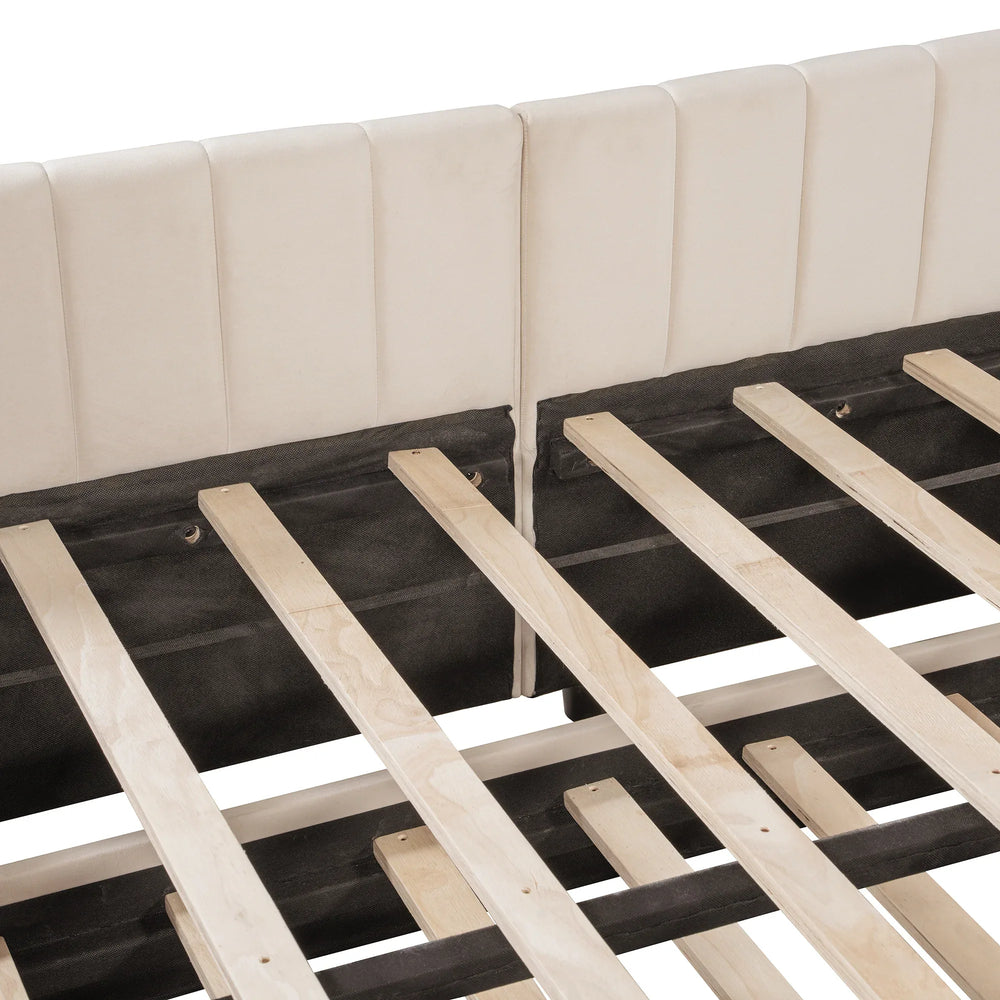 Upgrade your living or guest space with this versatile Full Size Upholstered Daybed featuring a plush L-shaped backrest and a convenient twin-size pop-up trundle. The elegant vertical striped upholstery in neutral beige adds a contemporary touch that blends seamlessly with any décor. Designed to provide exceptional comfort whether lounging or sleeping, this daybed combines form and function effortlessly. The hidden trundle easily pulls out and lifts to align perfectly with the full-size bed, creating extra sleeping space for guests without sacrificing room. Crafted with durable plywood and soft upholstery, it offers stable support without the need for a box spring. Its compact dimensions make it perfect for maximizing smaller rooms while keeping your space chic and organized. Elevate your home’s comfort and style today with this smart, multi-functional daybed solution.