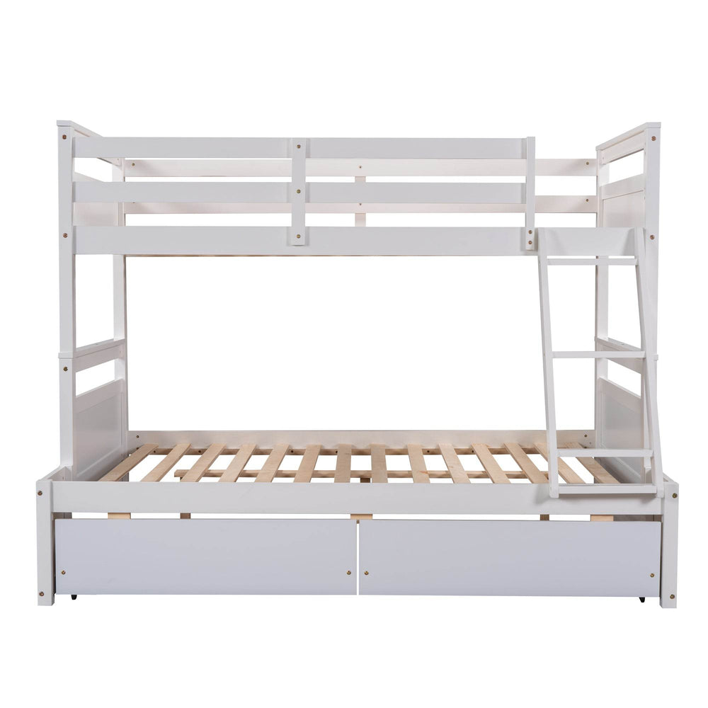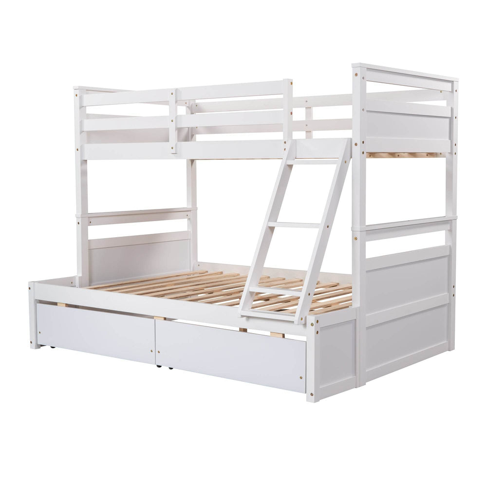 This versatile bunk bed is the perfect solution for families needing extra sleeping space without sacrificing style or functionality. Featuring a twin-size upper bunk and a full-size bottom bunk, it comfortably accommodates children or guests for sleepovers. Crafted from durable solid pinewood and reinforced with a strong frame, it ensures stability and long-term use. The included slat kit eliminates the need for box springs, offering fuss-free mattress setup. Under-bed drawers provide smart storage for toys, clothes, or bedding, helping keep bedrooms organized and clutter-free. Designed with safety in mind, it includes a full-length guardrail, headboard, and footboard. Its clean white finish blends effortlessly with most home décors. Plus, the bed can be separated into two individual beds for greater flexibility.