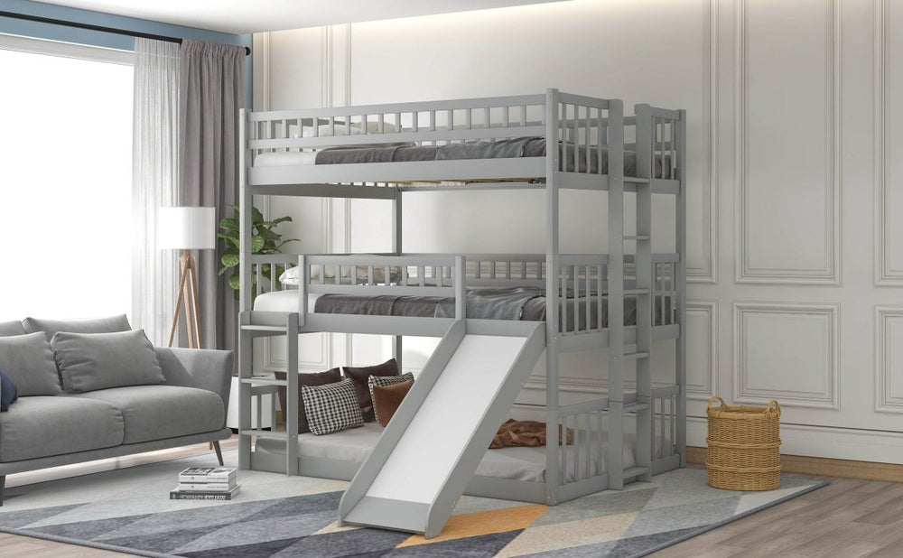 Designed for large families and sleepover guests, this full-over-full-over-full triple bunk bed offers a smart, space-saving solution without compromising comfort. Crafted from durable pine wood and plywood, its solid construction resists humidity and cracking to ensure lasting stability. The sleek gray finish adds a modern touch, easily blending with any bedroom décor. Two built-in ladders provide easy access to the upper and middle bunks, while sturdy guardrails offer safety throughout the night. The fun, convertible low slide supports playtime and helps develop balance and coordination. Flexible enough to be used as a stacked triple bunk or separated into three individual full beds, this triple bed adapts to your family’s evolving needs. Elevate your bedroom’s functionality and style today.