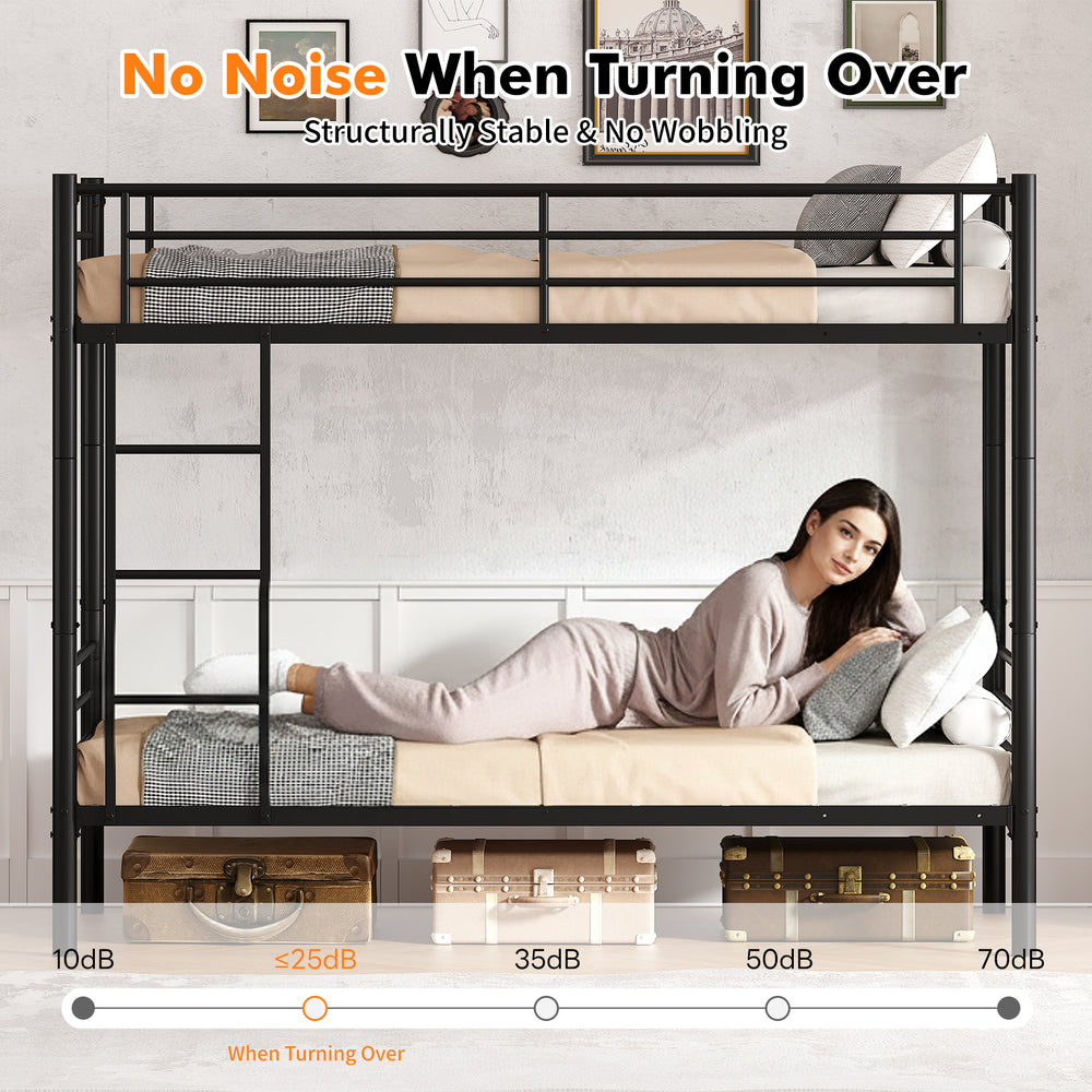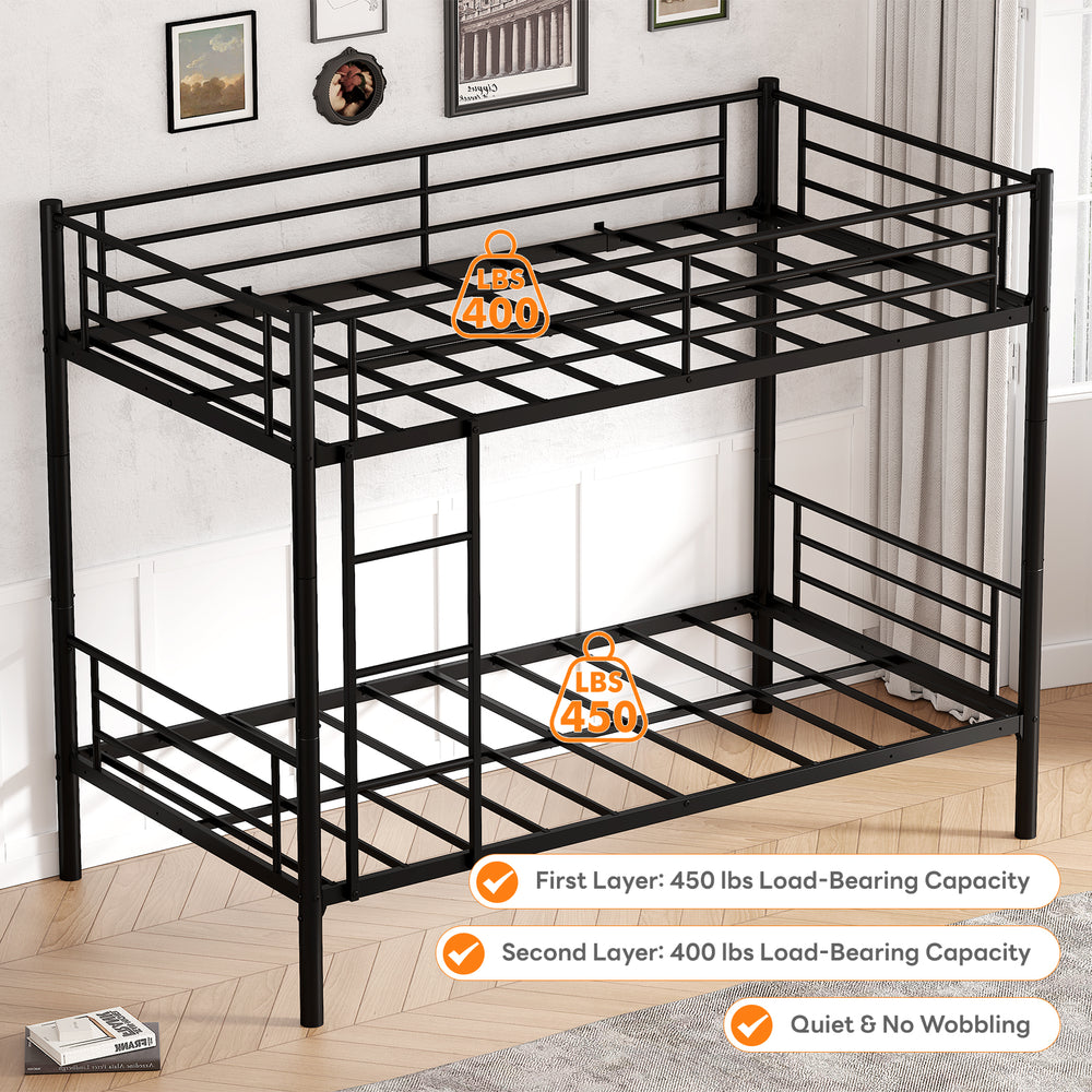 Maximize your bedroom’s functionality and aesthetic with this sleek twin over twin bunk bed in bold black metal. Crafted from heavy-duty metal, this bunk bed is built for lasting durability and stability, providing a secure sleeping solution for kids or guests. Its classic headboard with curved lines adds a modern touch that complements any room décor. Designed with an embedded frame to prevent mattress sliding, it ensures safety and comfort while maintaining a tidy space with 8.9 inches of under-bed clearance—perfect for storing toys, books, or bins. Noise-free construction and anti-slip foot pads protect your floors and promote a restful night's sleep. Whether for a shared room or space-saving guest setup, this bunk bed combines practicality with contemporary design. Elevate your living space today with this stylish and sturdy metal bunk bed.