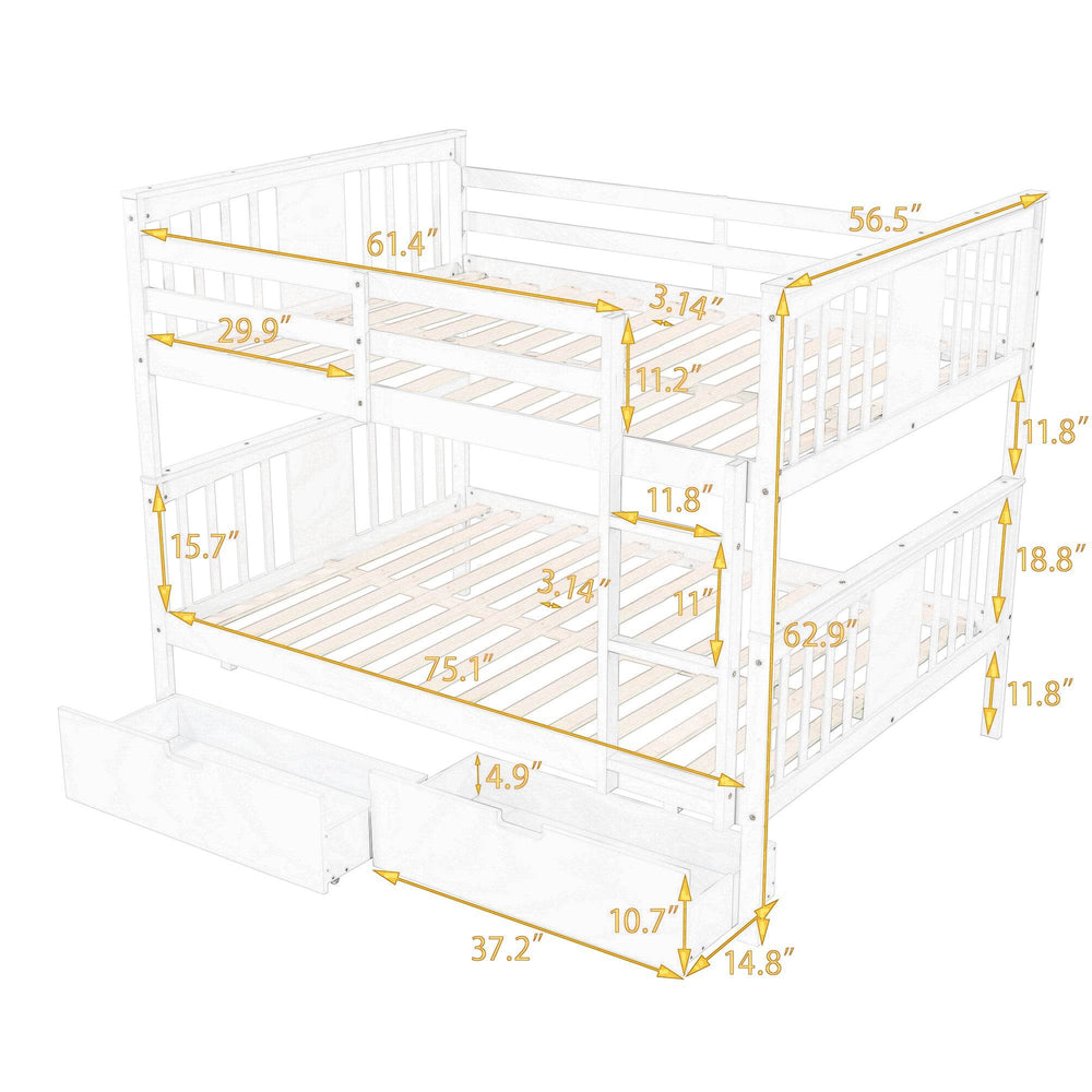 Full over full bunk bed crafted from solid wood offers sturdy, space-saving sleep solutions with integrated drawers for storage. Easily separates into two beds, features safety guardrails, and suits bedrooms needing versatile, durable furniture without requiring box springs.