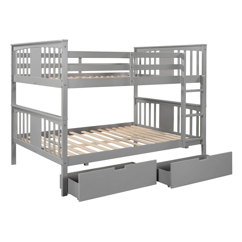 Perfect for bedrooms and guest rooms, this full over full bunk bed combines functional design with enduring style. Crafted from solid pine wood and premium plywood, it offers sturdy support for years of use. The two full-size beds stacked vertically save space while accommodating multiple sleepers comfortably. Underneath, a pair of built-in drawers provides ample storage for bedding, toys, or other essentials, keeping your room neat and organized. The bed easily separates into two individual full beds for flexible room arrangements. Safety is prioritized with a full-length guardrail on the upper bunk and a secure ladder with handrails. Its clean gray finish complements a variety of decors, making it a versatile addition to any home.