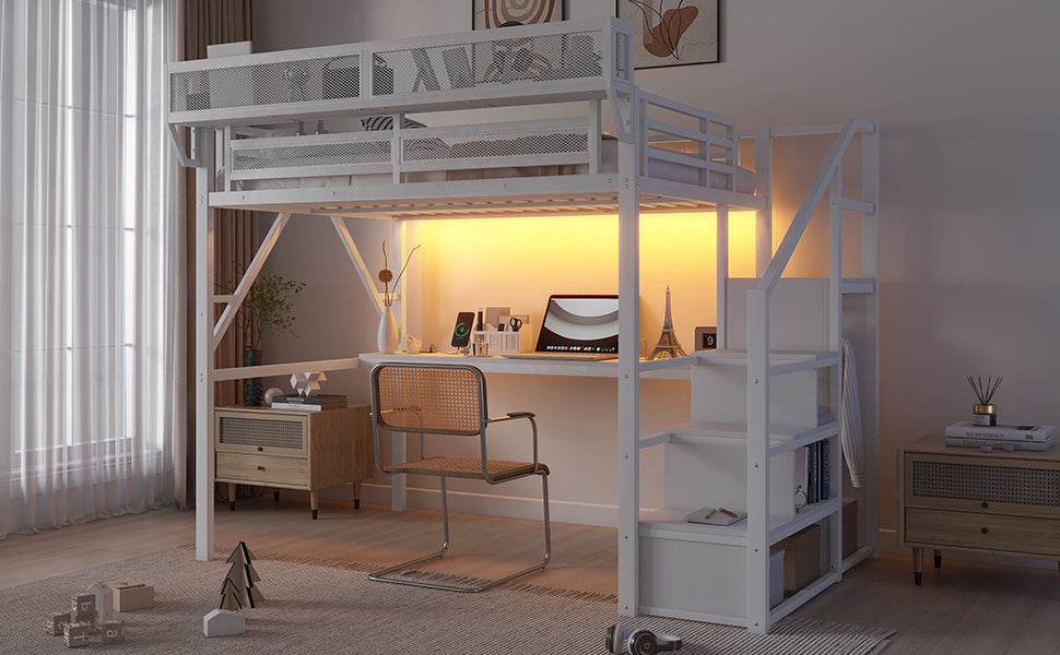 Designed for kids and teens, this full size metal loft bed combines durability, functionality, and modern style. Crafted from high-quality metal, it offers sturdy support with a 350-pound capacity and a sleek white finish that brightens any bedroom. The loft design frees up floor space by elevating the bed, creating a versatile area underneath featuring a spacious desk with built-in outlets and USB ports—perfect for studying, gaming, or working. An integrated staircase with storage compartments and a wardrobe adds convenient organization without clutter. Smart RGB LED lights with customizable colors and settings transform the room ambiance, making bedtime fun and cozy. The upper bed includes mesh-sided storage shelves for easy access to essentials while ensuring safety with a high guardrail and sturdy frame. Recommended mattress thickness is 6 inches (15 cm) to complete the setup. Elevate your child’s bedroom with this multi-functional full size loft bed today.