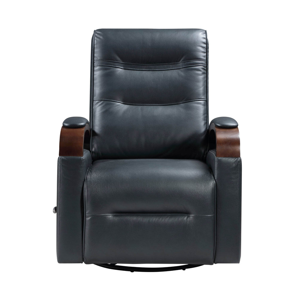 Enhance your living room with this contemporary swivel gliding recliner, upholstered in breathable navy leather for lasting comfort and easy care. Crafted on a solid wood frame with sturdy plywood and metal reinforcements, it provides reliable support for up to 300 pounds. Sink into plush foam padding layered over pocket coils for exceptional cushioning, while the pull-handle reclining mechanism and smooth gliding motion let you effortlessly find your ideal lounging position. The full 360-degree swivel offers flexible movement, making it perfect for relaxing, reading, or entertaining. Solid rubberwood arms in a warm brown finish add an elegant, modern touch that complements any primary living space. Easy to assemble and designed with attached cushions and a removable seat back, this recliner combines style and function to elevate your relaxation today.