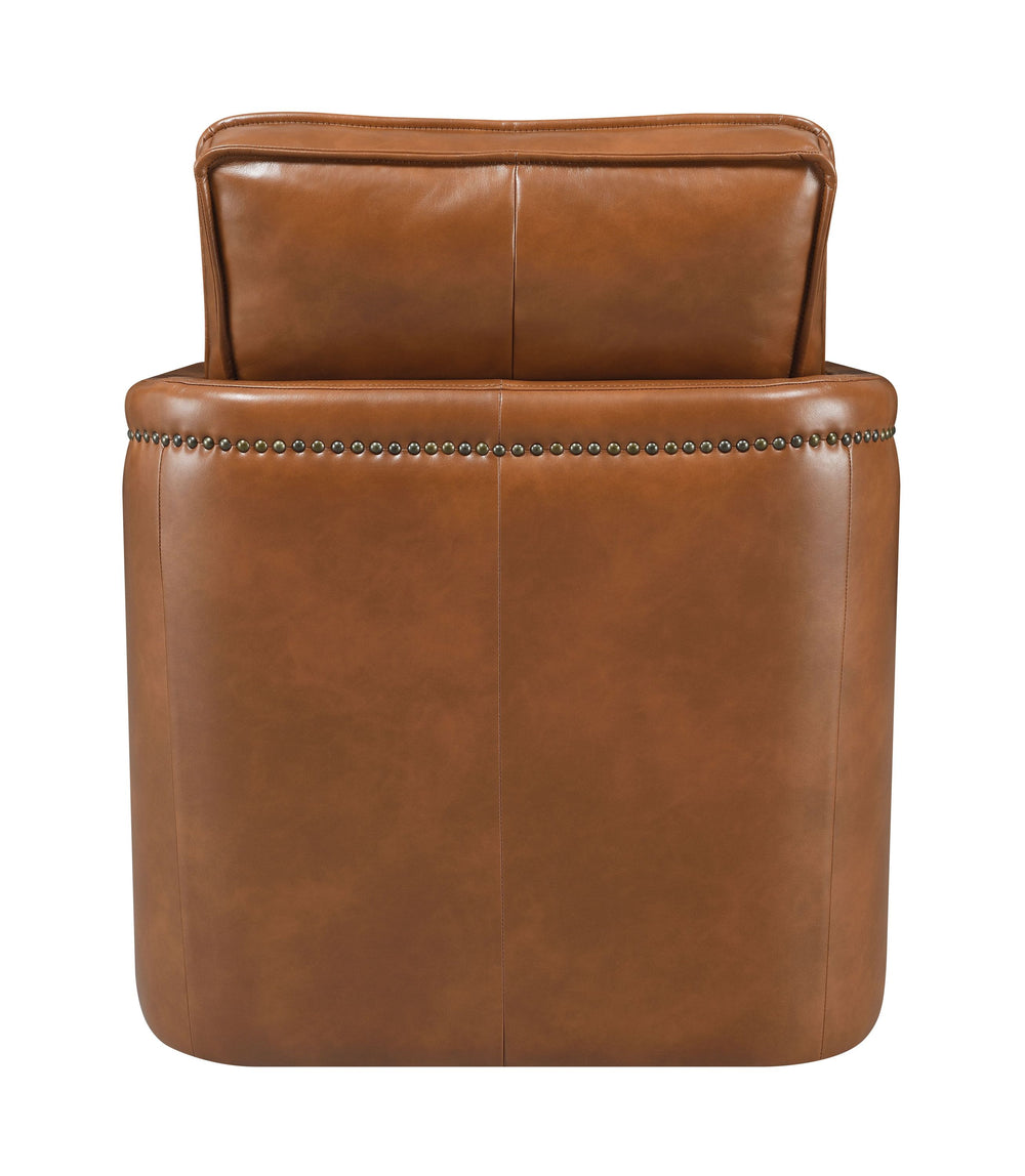 This brown faux leather swivel accent chair features pocket coil seating and down feather cushions for plush comfort and support. Its 180-degree swivel and removable covers offer versatile mobility and easy maintenance, enhancing any living room or lounge space.