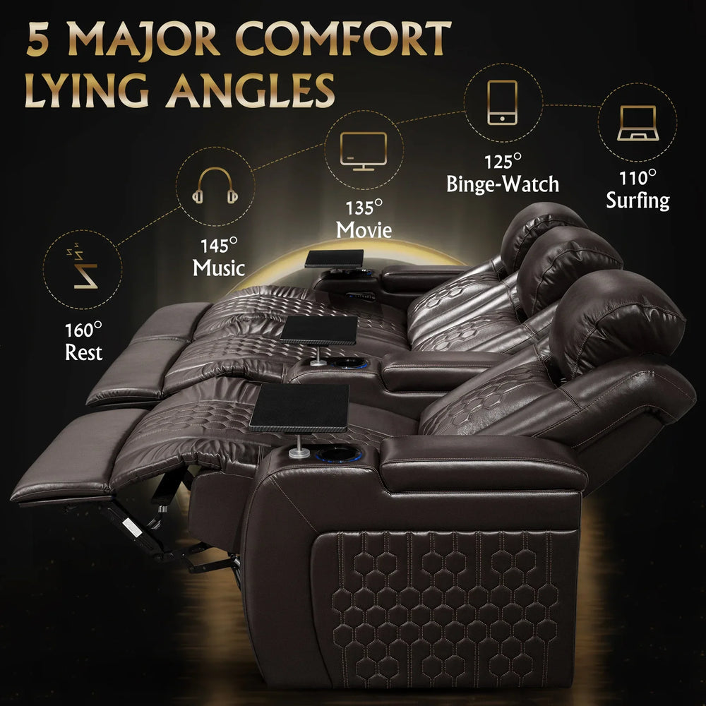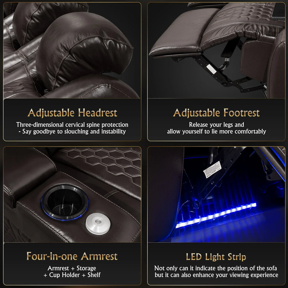 Sink into ultra-plush comfort with this premium recliner crafted from genuine Top-Grain Nappa leather in a rich coffee tone. Featuring advanced Comfort-Matrix Technology, it combines memory foam, cooling gel, springs, and supportive foam to deliver exceptional ergonomic support and temperature regulation. The fully adjustable lumbar support and headrest allow you to customize your seating position for ideal comfort during long movie nights or relaxing at home. Equipped with smart charging capabilities, including fast 18W USB-C and USB-A ports, this recliner keeps your devices powered within easy reach. Dynamic RGB LED lighting with 37 vibrant colors and illuminated cup holders enhance your entertainment space with ambiance and convenience. The air-piston-powered arm storage offers discreet room for remotes and snacks, while sleek black chrome accents add a modern touch. Elevate your home theater or living room setup with this versatile luxury power recliner today.