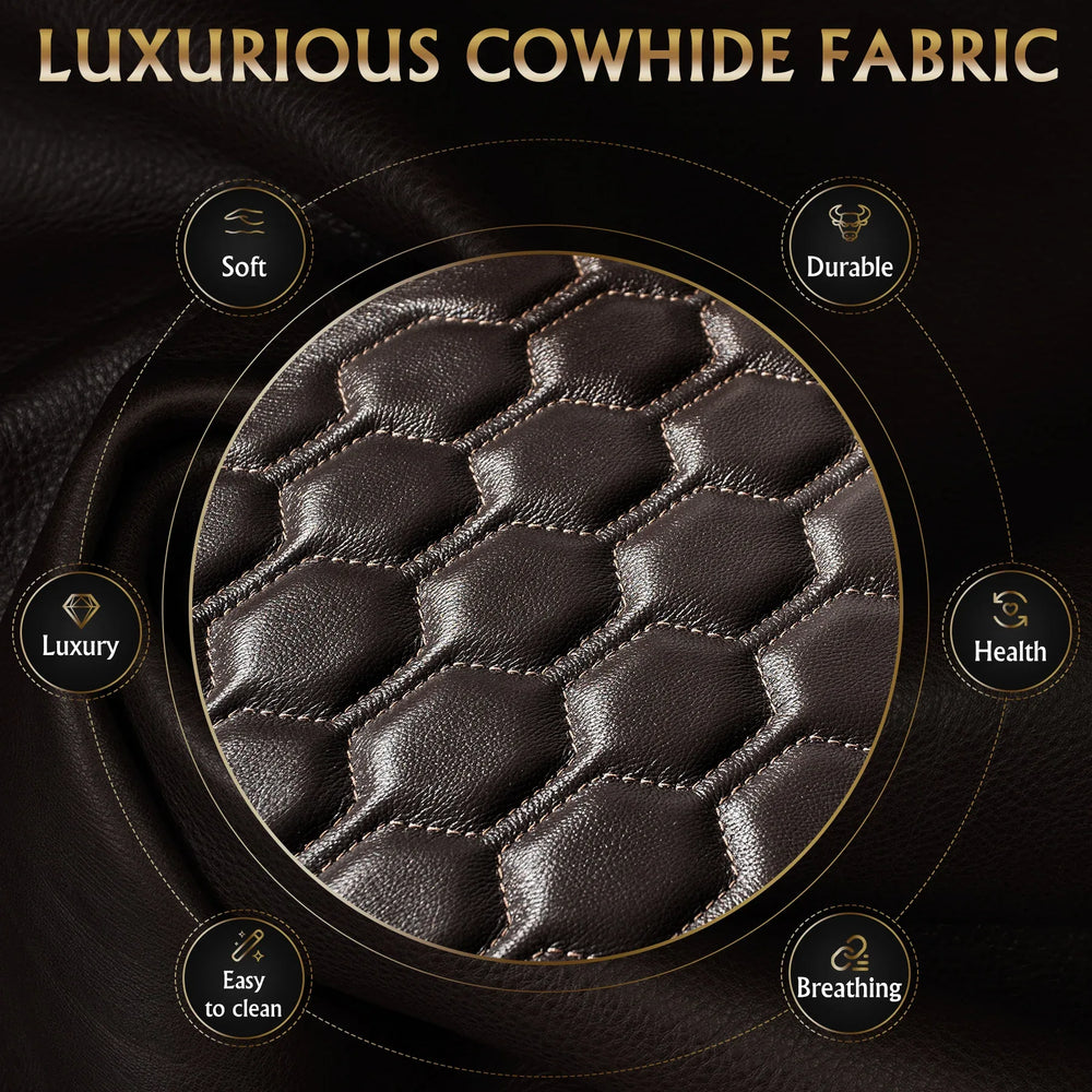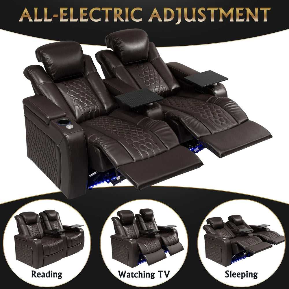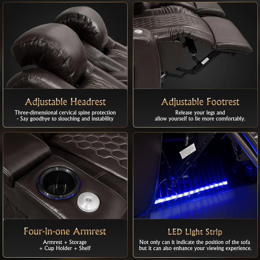 Unwind in style and luxury with this premium coffee-colored power recliner crafted from genuine top-grain Nappa leather. Designed for superior ergonomic support, it features Comfort-Matrix Technology that combines memory foam, cooling gel, springs, and support foam to provide ultra-plush comfort while keeping you cool. Fully adjustable lumbar support and headrest empower you to find the perfect seating position for long movie nights, relaxation, or reading. Integrated smart charging ports ensure your devices stay powered, while dynamic RGB LED lighting with 32 color options sets the ideal ambiance. Additional conveniences include illuminated cup holders and air-piston-powered arm storage for easy access to drinks, remotes, or snacks. Elevate your home theater or living space with this state-of-the-art recliner that blends cutting-edge technology with exquisite craftsmanship.