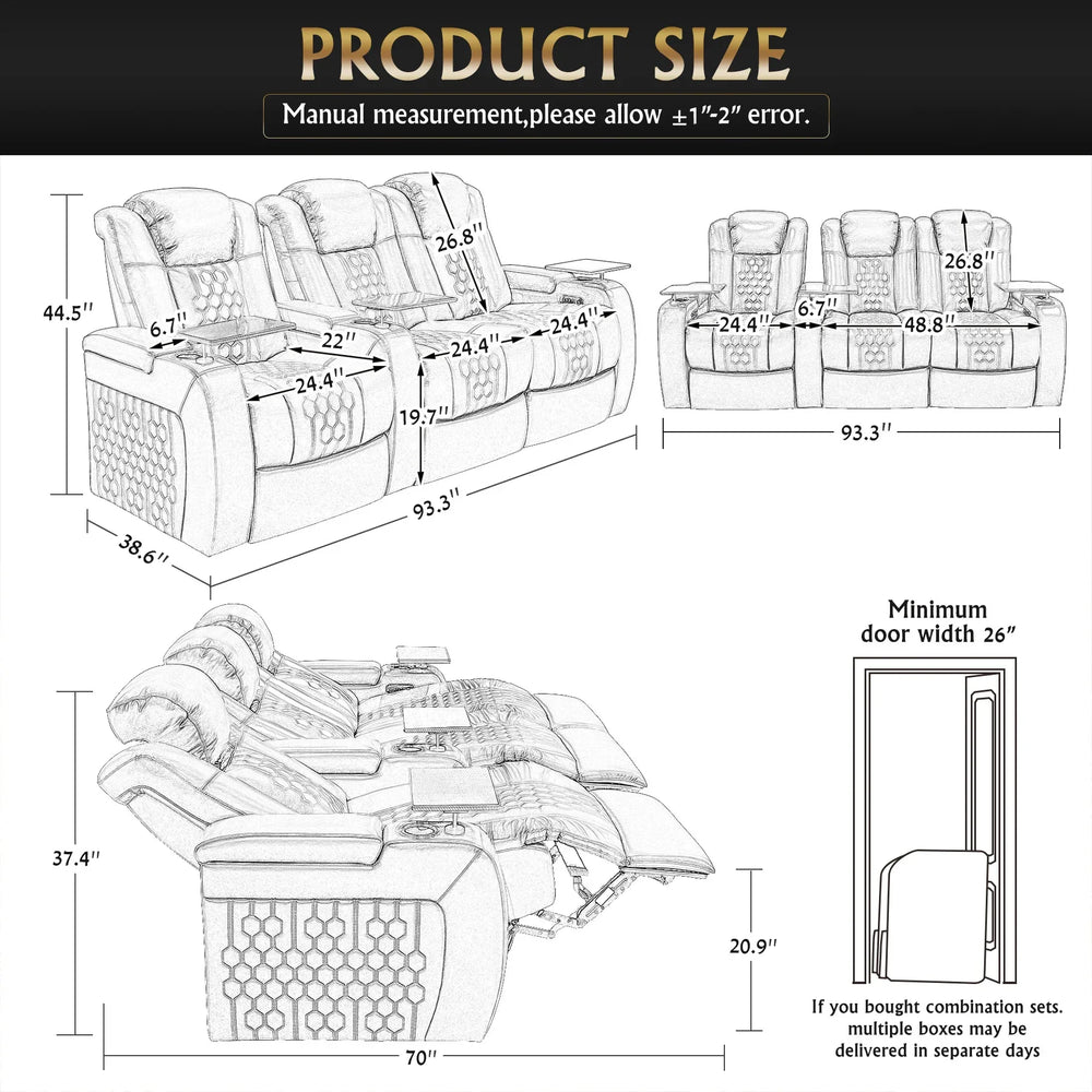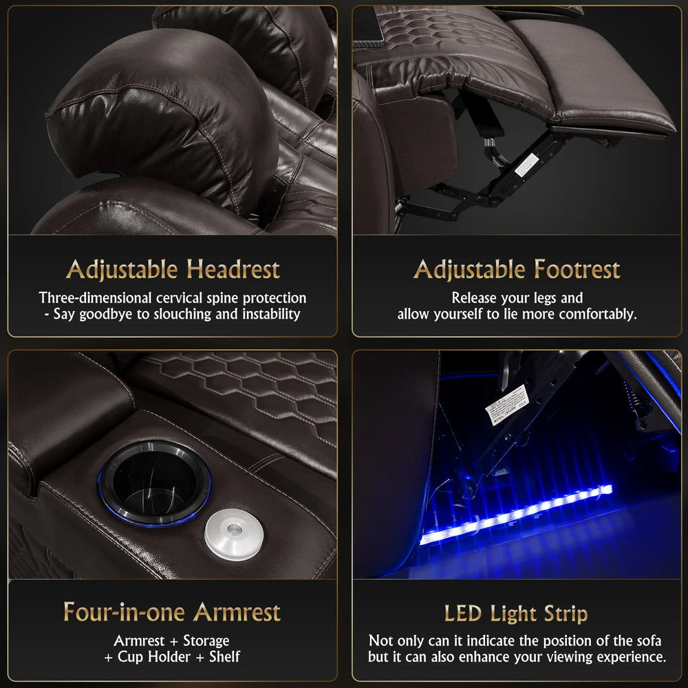 Elevate your relaxation with this premium power recliner crafted from top-grain Nappa genuine leather in a rich coffee color. Designed to deliver ultra-plush comfort, it features Comfort-Matrix Technology that combines memory foam, cooling gel, springs, and support foam to provide exceptional ergonomic support and all-day cooling. Fully adjustable lumbar support and headrest allow you to customize your seating position for optimal relaxation, perfect for long movie nights or unwinding after a busy day. Stay connected and refreshed with integrated 18W USB-C and USB-A charging ports, plus a convenient cup holder illuminated by dynamic RGB LED lighting, adding stylish ambiance to your home theater setup. The smooth air-piston-powered arm storage keeps remotes and snacks within easy reach while maintaining a sleek, modern look with black chrome accents. Upgrade your lounge experience and enjoy cutting-edge comfort and convenience today.
